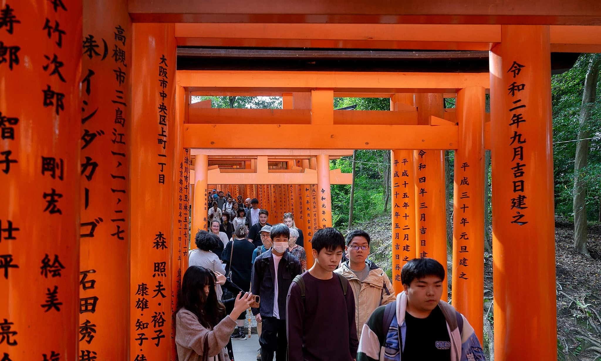 Fushimi Inari Shrine in Kyoto features over 10,000 vibrant red torii gates, a powerful symbol of the city. Tourists form long lines, pushing and shoving from early morning to capture photos. It is not a place for a leisurely stroll, but rather one where you are constantly propelled forward by the crowd.