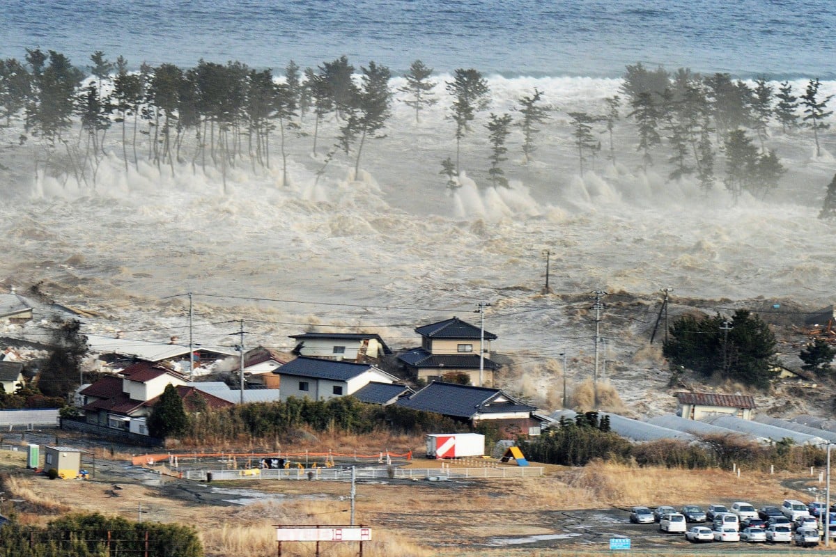 The tsunami triggered by the Great East Japan Earthquake engulfed houses in Natori, Miyagi prefecture, on 11/3/2011. Photo: Kyodo