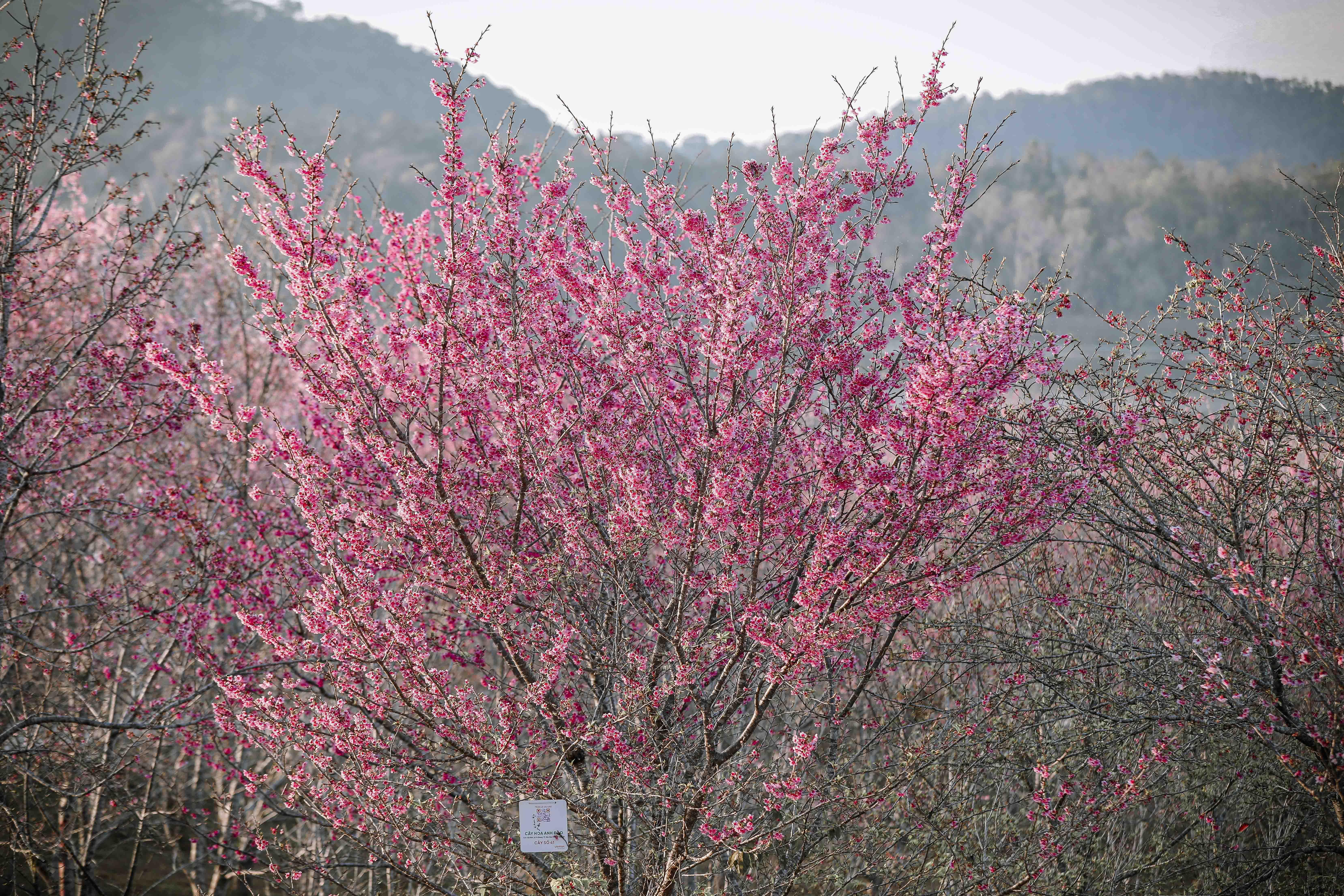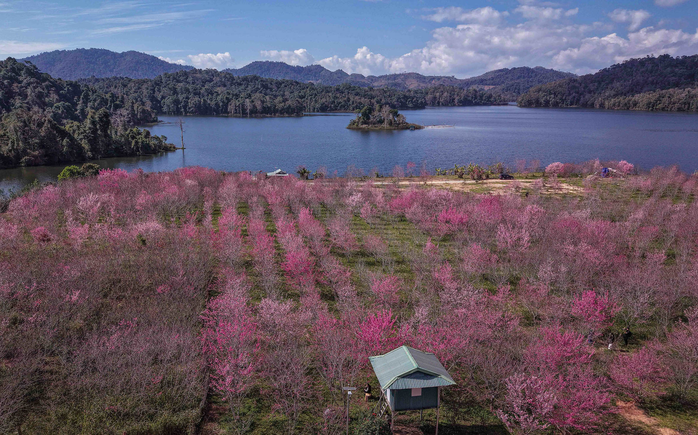 The flower planting area, often referred to by locals and tourists as Dien Bien's "flower island," is located on a small island within the Pa Khoang hydropower lake, about 20 km from the provincial center. Each cherry blossom tree is tagged with a QR code, allowing visitors to learn about the specific variety. From the flower garden, tourists can gaze towards Pu To Co mountain, which served as an observation post during the Dien Bien Phu Campaign, creating a unique blend of natural scenery and historical significance.