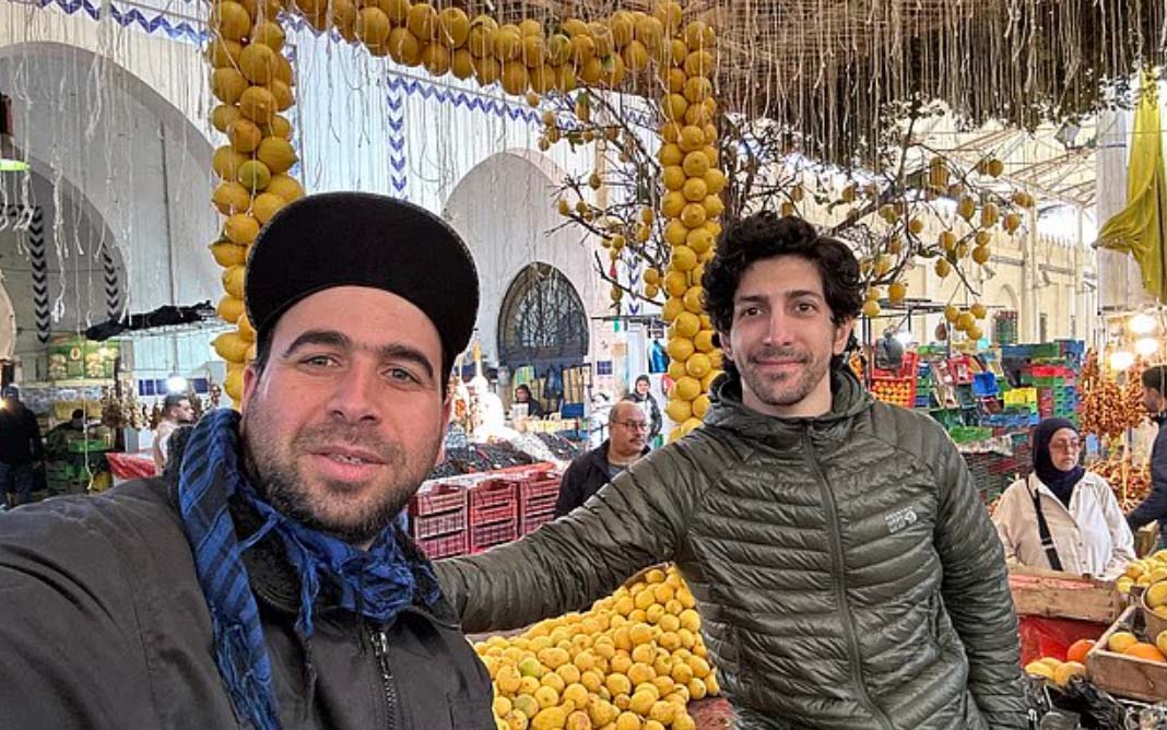 Michael Zervos (right) with locals in a Tunisian market. Photo: DM |