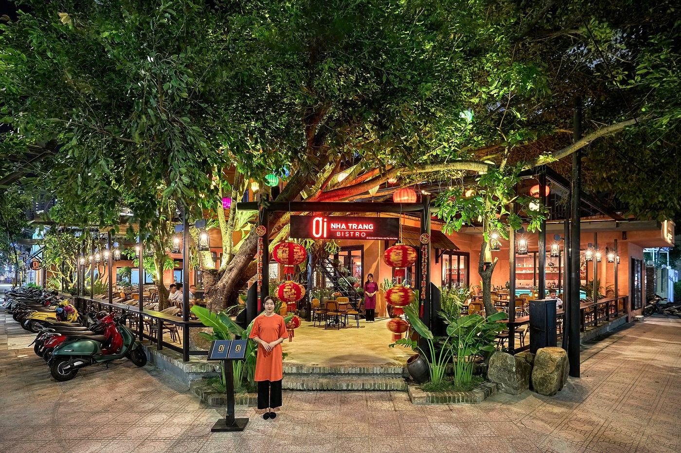 Nestled in the heart of the dynamic coastal city, Oi Nha Trang restaurant is a favored destination for domestic and international tourists, as well as local residents. From the outside, the restaurant stands out with its nostalgic earthy orange tones and a lush green garden courtyard. |