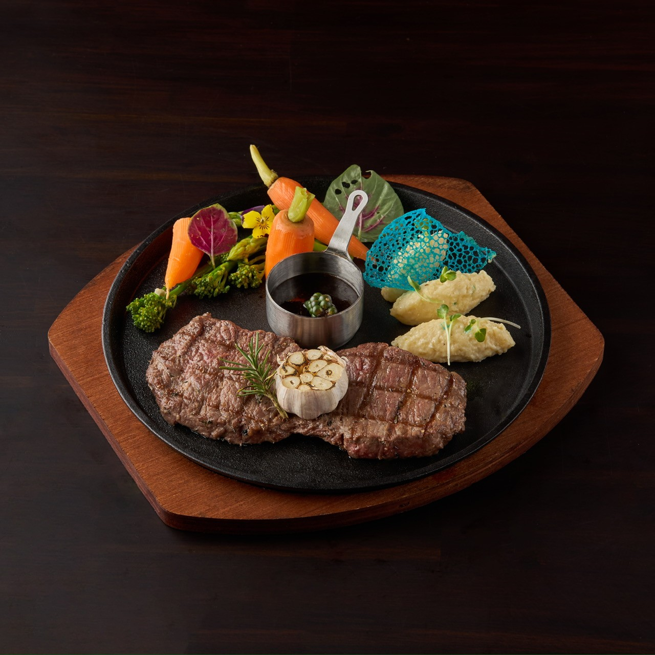 On the european menu, the charcoal-grilled steak, cooked to perfection and served with BBQ sauce, is a popular choice among diners. |