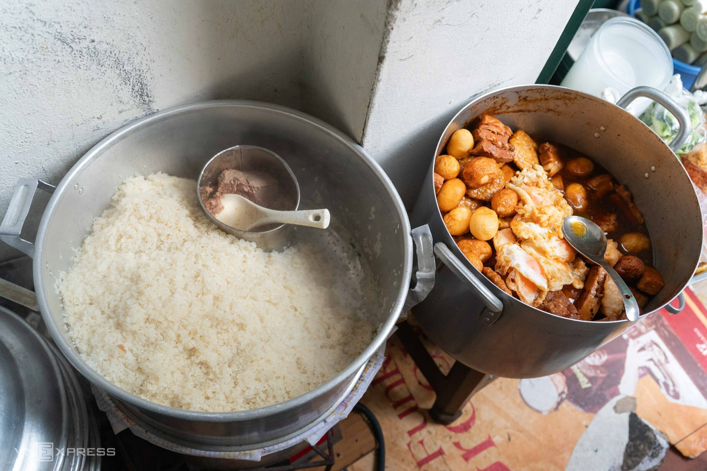 Each day, the stall sells about 50-60 kg of sticky rice. The owner often places the pate tray inside the sticky rice pot to ensure it stays hot and fragrant.