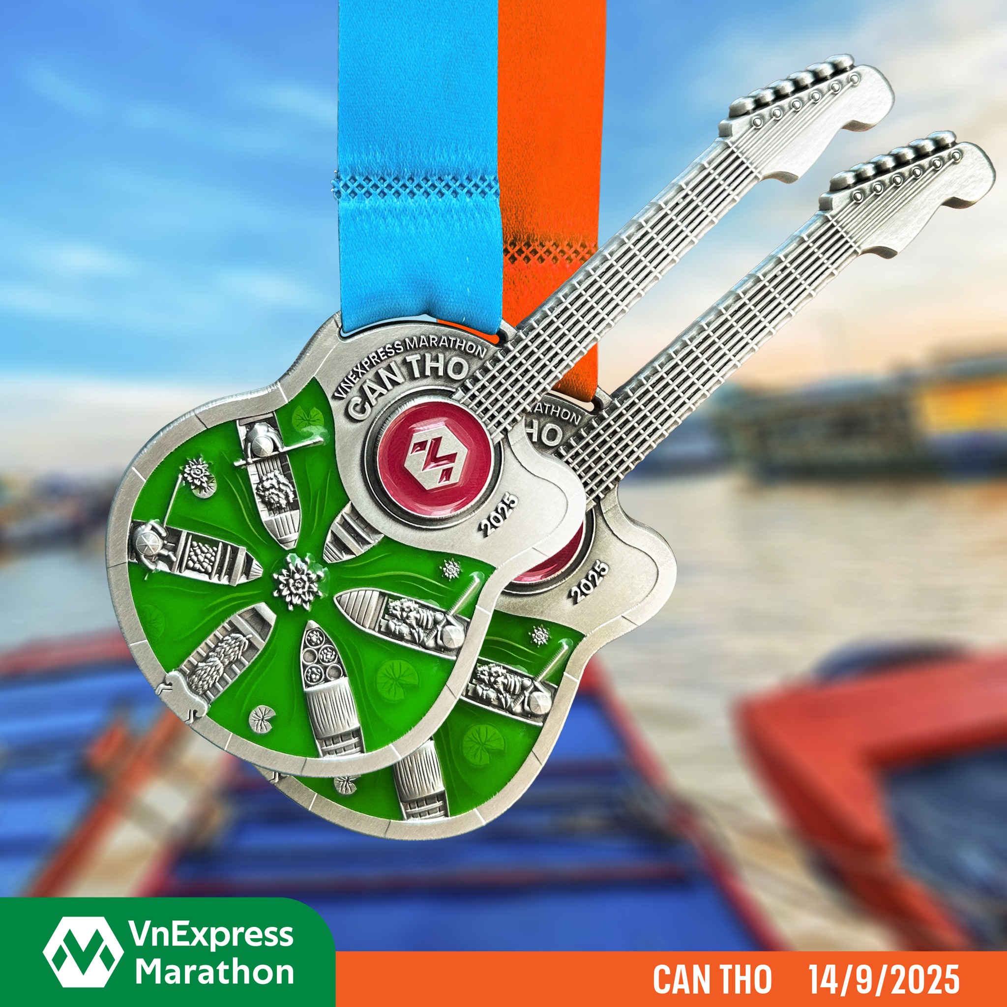 The VnExpress Marathon Can Tho medal is inspired by the boats on Cai Rang floating market and the lap steel guitar. Photo: VnExpress Marathon