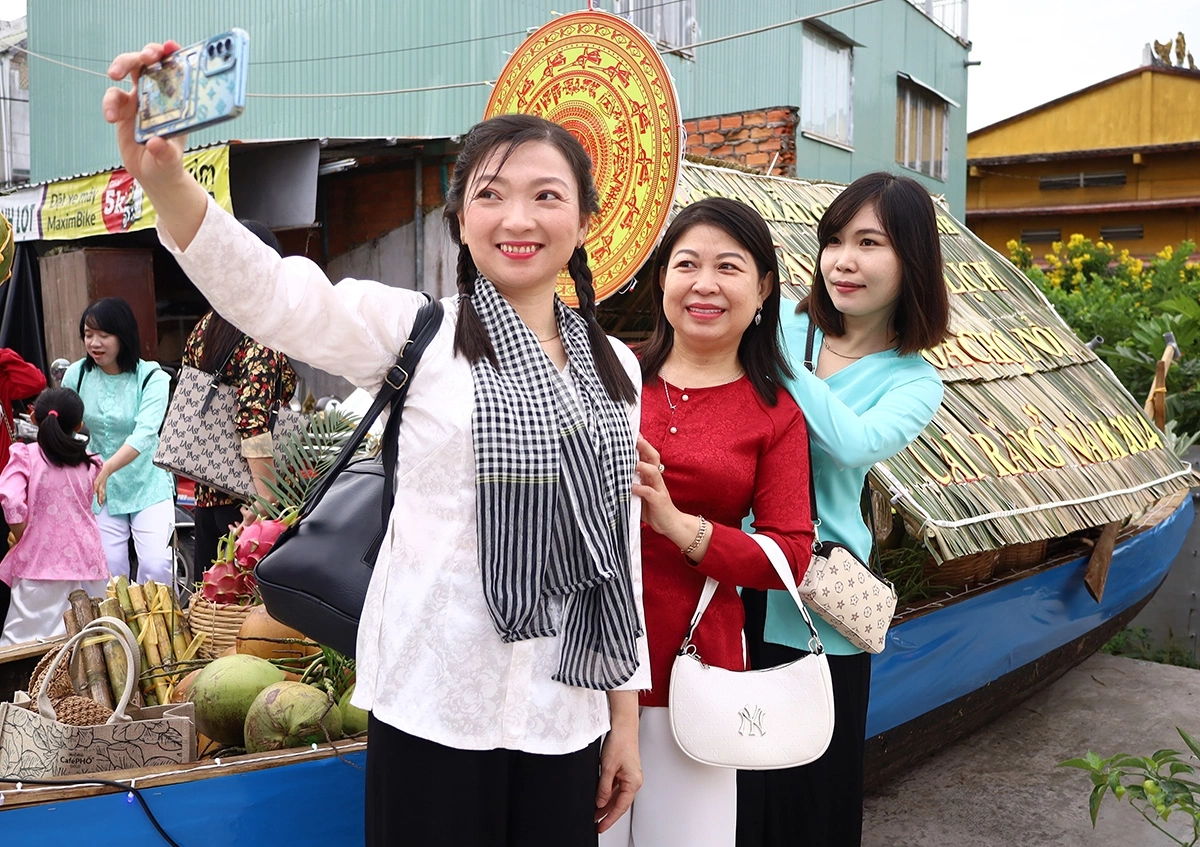 Besides agricultural products, the floating market has "mobile stalls" for visitors to experience. Locals sell fresh fruit, prepare dishes on the spot, and offer dried specialties, cakes, and candies as souvenirs, such as coconut candy, rice paper, dried snakehead fish, and plum wine.