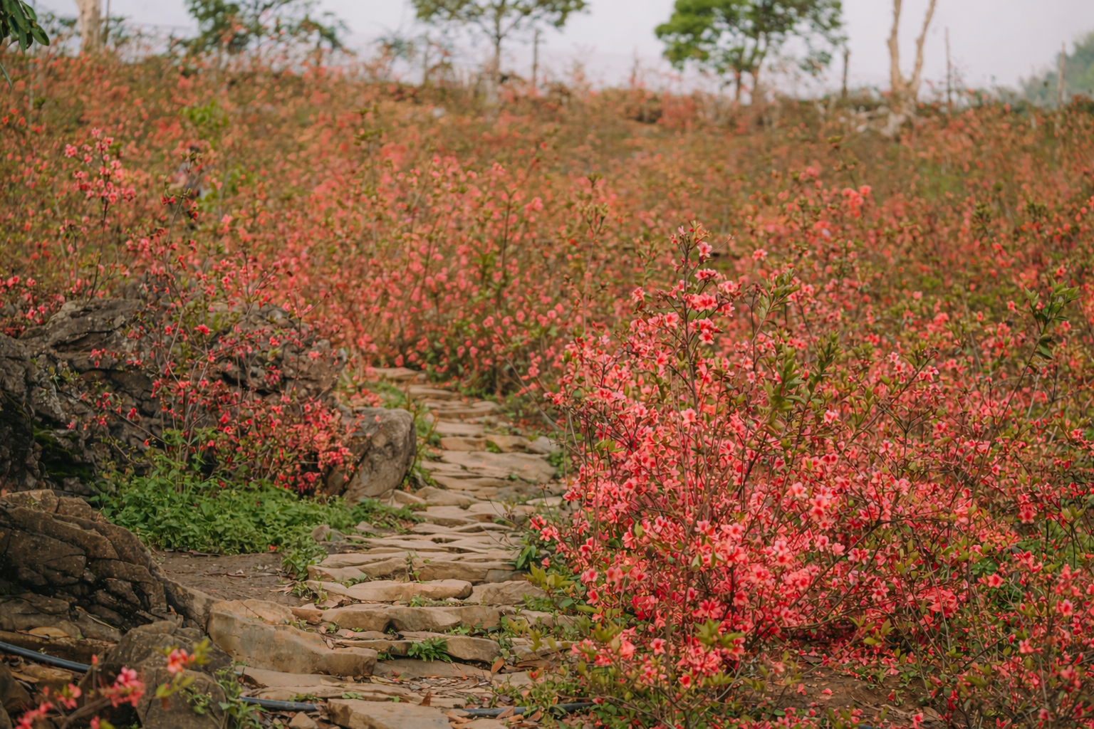 Rhododendron flowers come in various colors, including red, pink, and white, with red being the most common. The blooming season typically extends from february to april. In Vietnam, this species is found in several mountainous provinces such as Lao Cai, Ha Tinh, Quang Tri, Hue, and Quang Ngai.