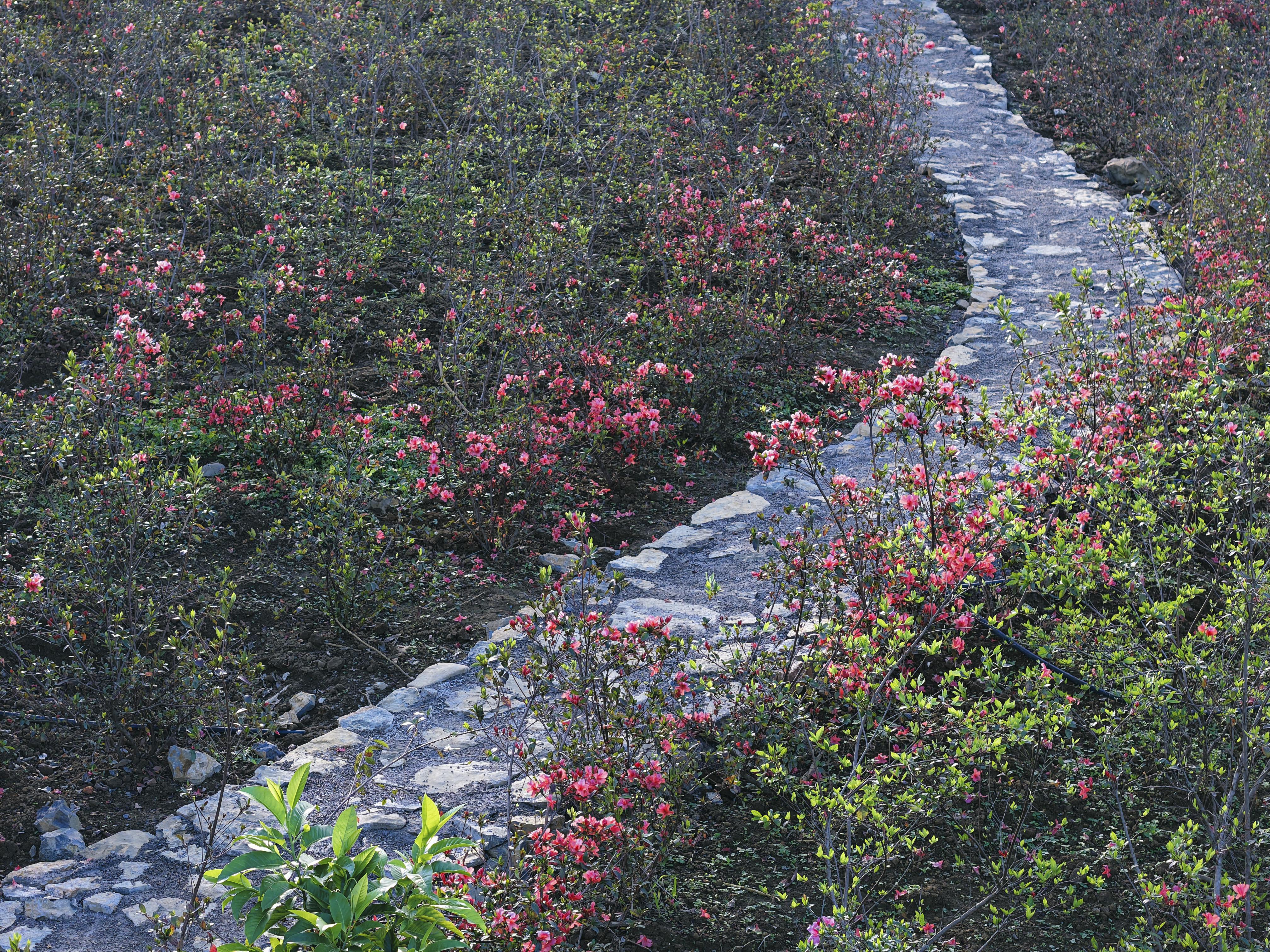 The garden owner stated that rhododendrons typically grow in deep forests, but they have been propagated and planted here to create an additional check-in location for tourists.