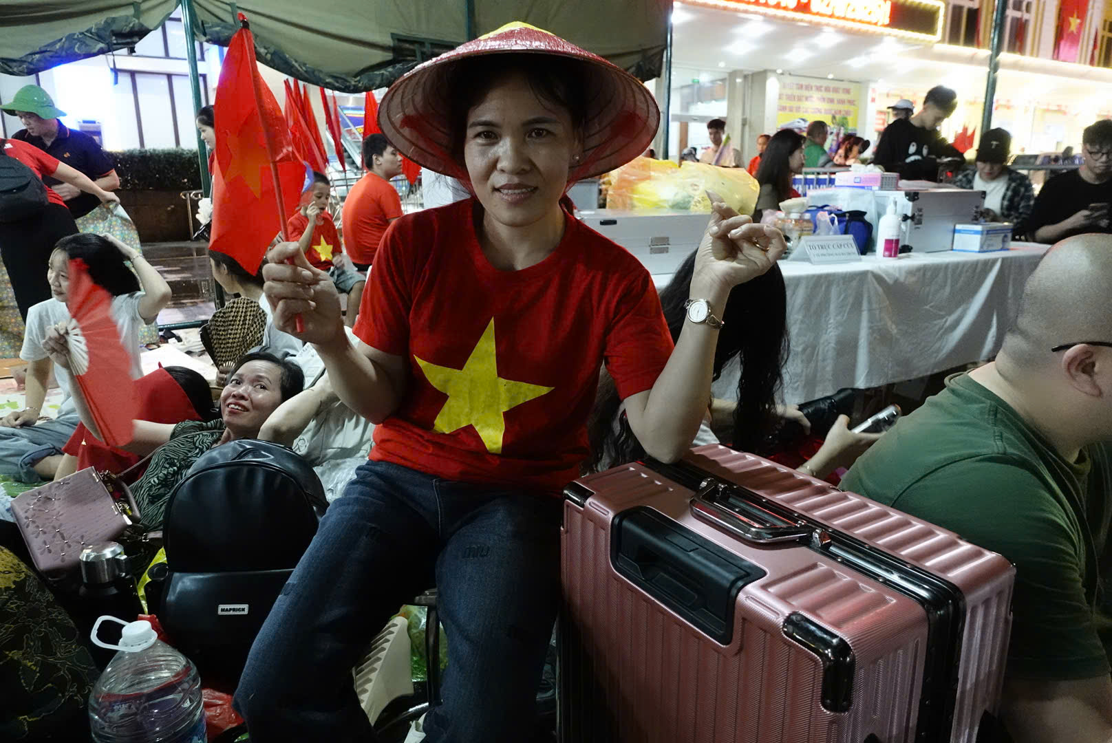 Dang Hien, from Quang Phu Cau village, arrived at Hanoi Railway Station with her 14 family members at noon on 29/8. They left home at 12 p.m., arriving at the station at 2 p.m. Without even stopping at their rented rooms, they rushed to secure their viewing spots. All 14 family members wore matching red and gold star outfits and brought large suitcases packed with supplies to camp out from the night of 29/8 until 2/9.