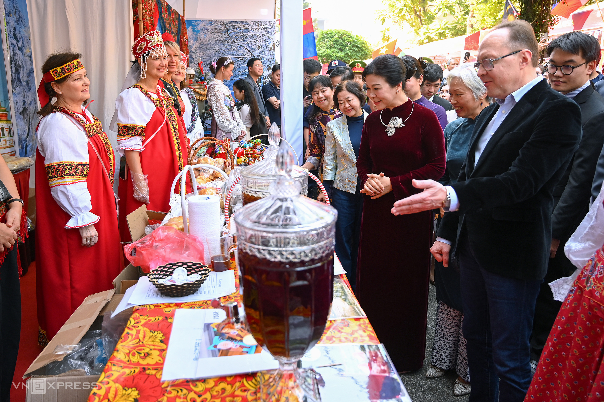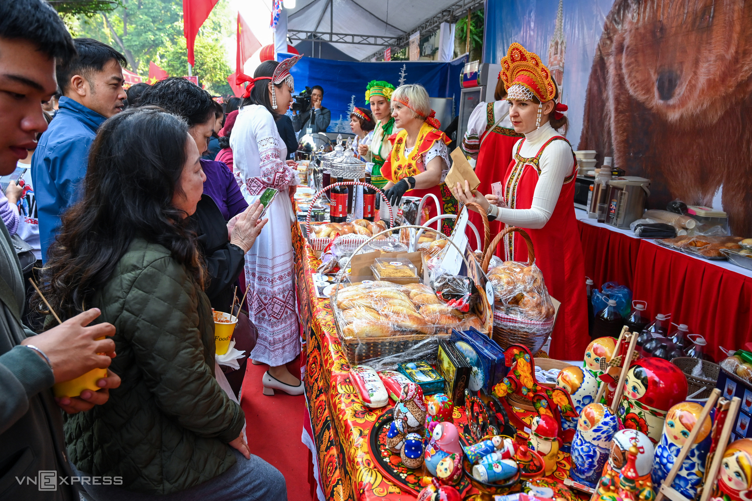 The Russian food booth, featuring traditional dolls, attracts many visitors. |