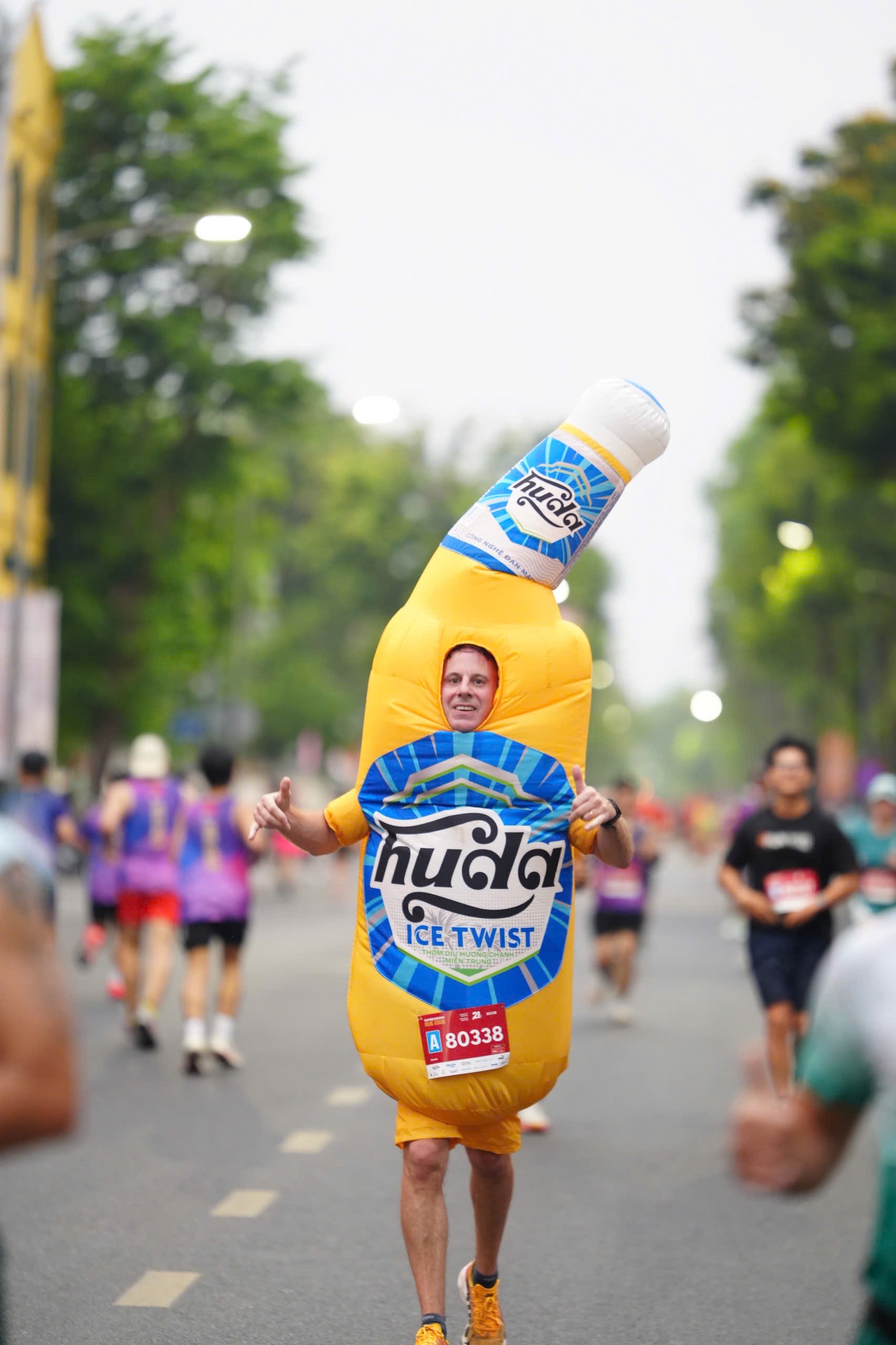 A foreign tourist dressed as a Huda beer bottle on the race course, creating a humorous and friendly image, while also referencing a brand long associated with central Vietnam.