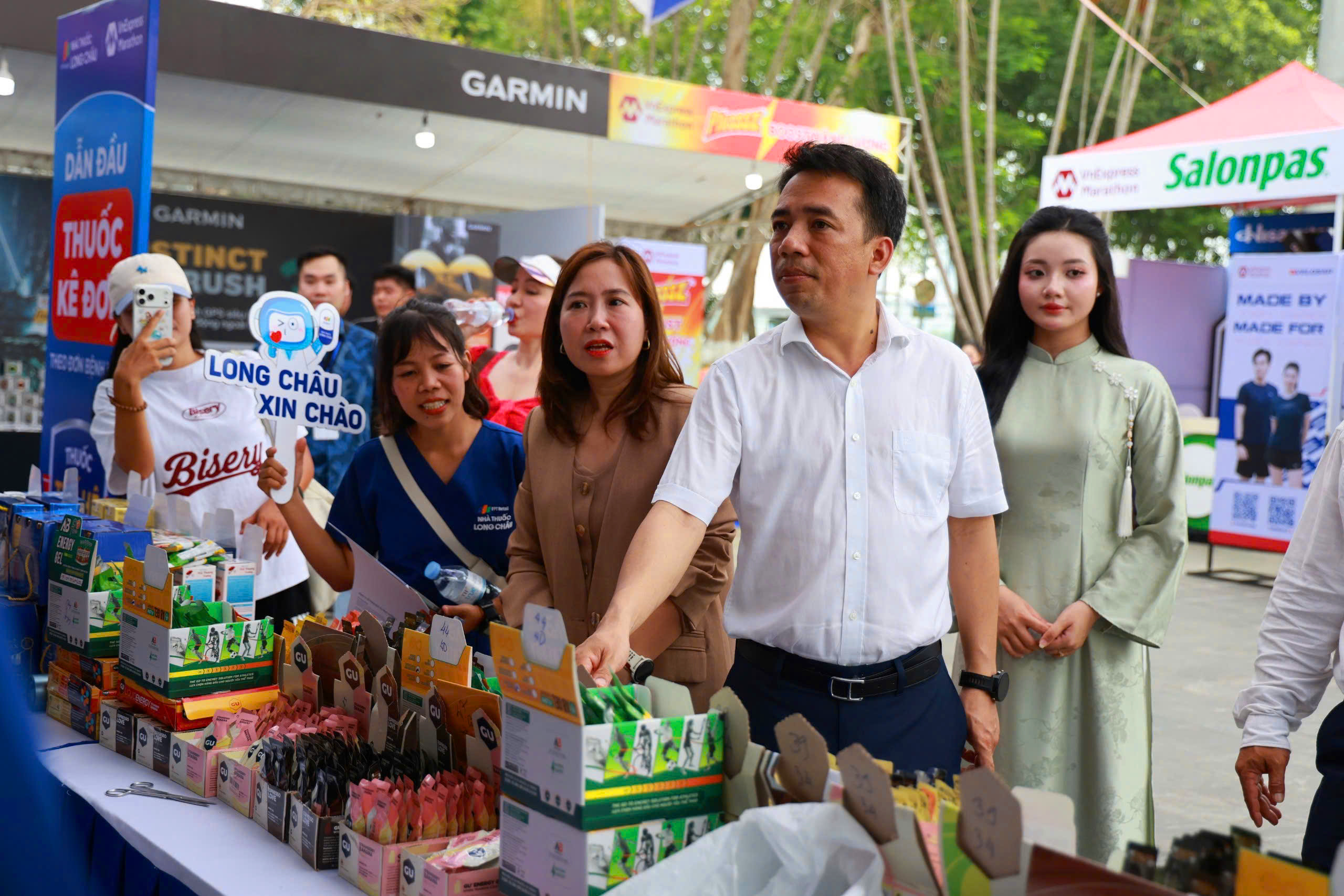 This year's Expo also saw the presence of Tran Huu Thuy Giang, Vice Chairman of Hue City People's Committee. He stated that each season the race is organized, it provides an opportunity for the city to promote its cultural beauty and heritage to domestic and international runners. In the photo, the leader and representatives from the organizing committee visit the booths at the event area.