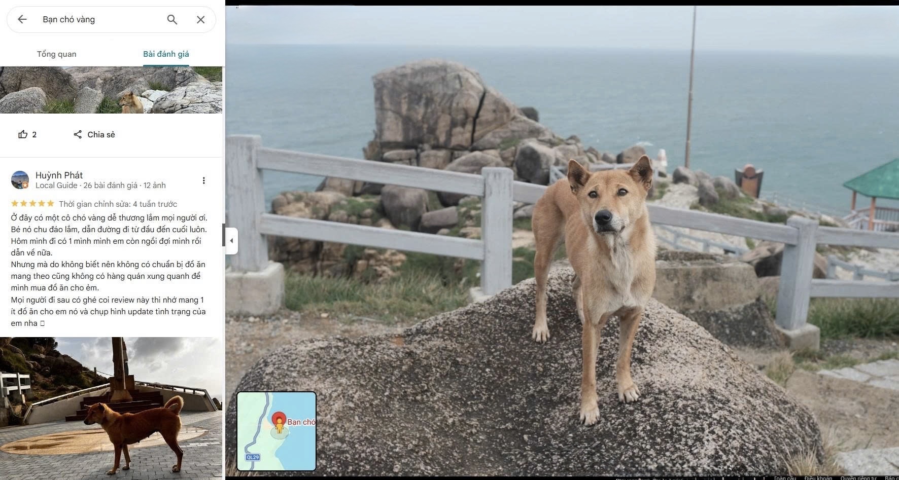 On Google Maps, a user created a location named "Ban cho vang" (Golden Dog Friend) situated between the path to the lighthouse and the road to Mui Dien. By 27/1, this location had received dozens of 5-star reviews, with most tourists sharing interesting stories about their encounters with the dog.