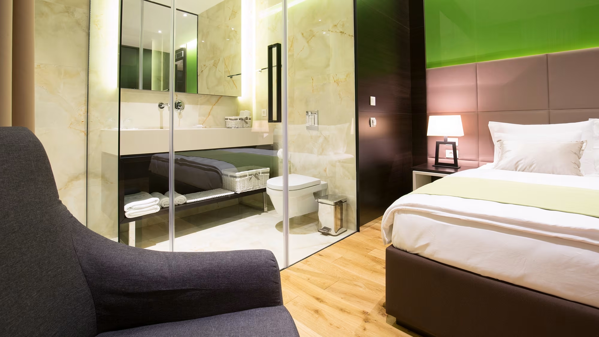 Hotel room with open-plan bathroom featuring glass partition. Photo: rilueda/iStockphoto