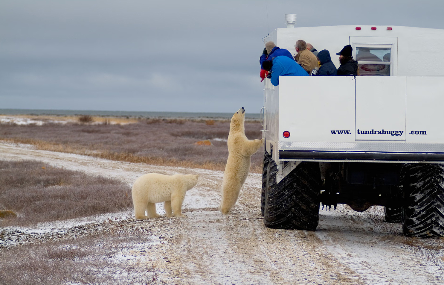 Polar bears approach a Tundra Buggy to observe tourists in Churchill. Photo: Alamy