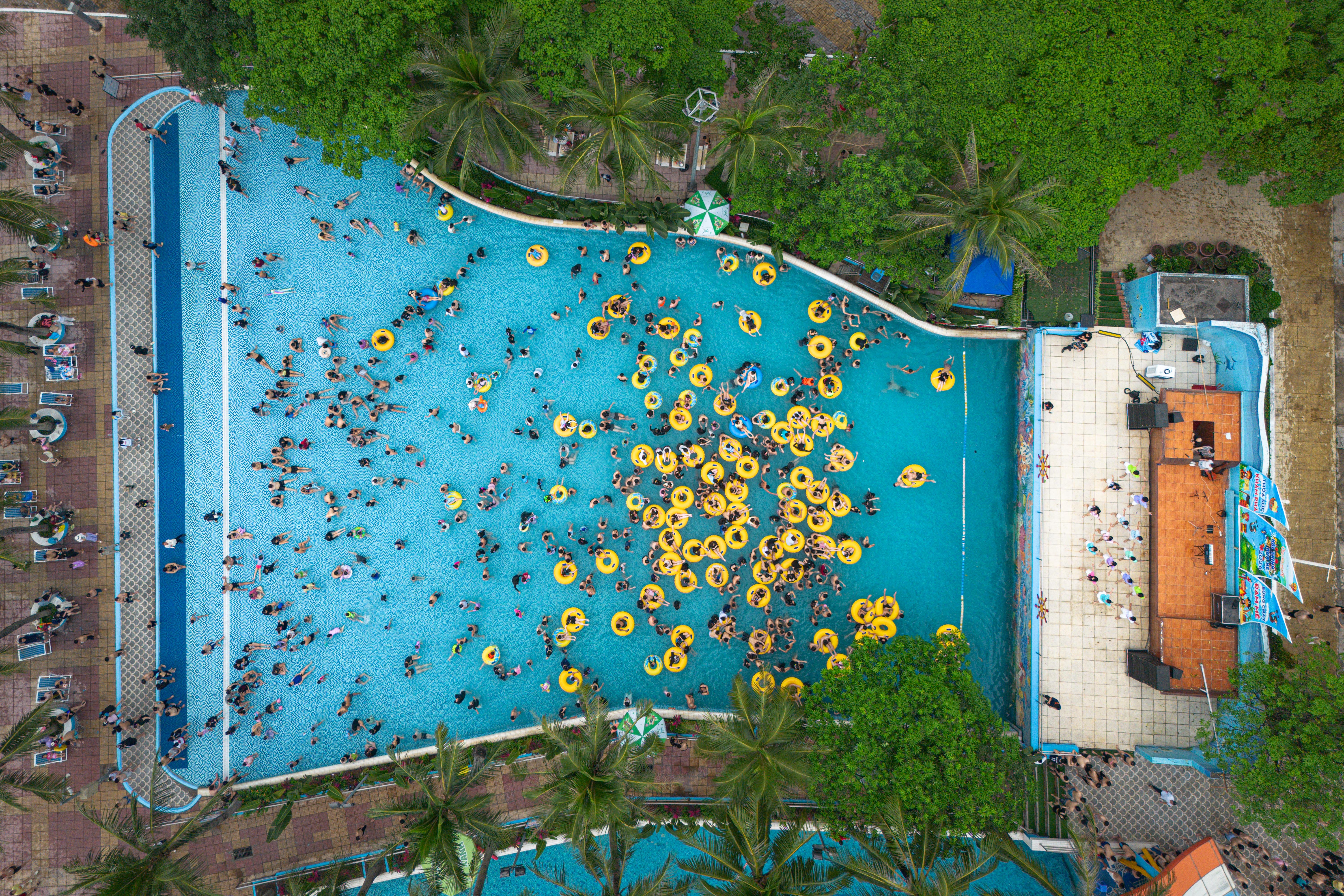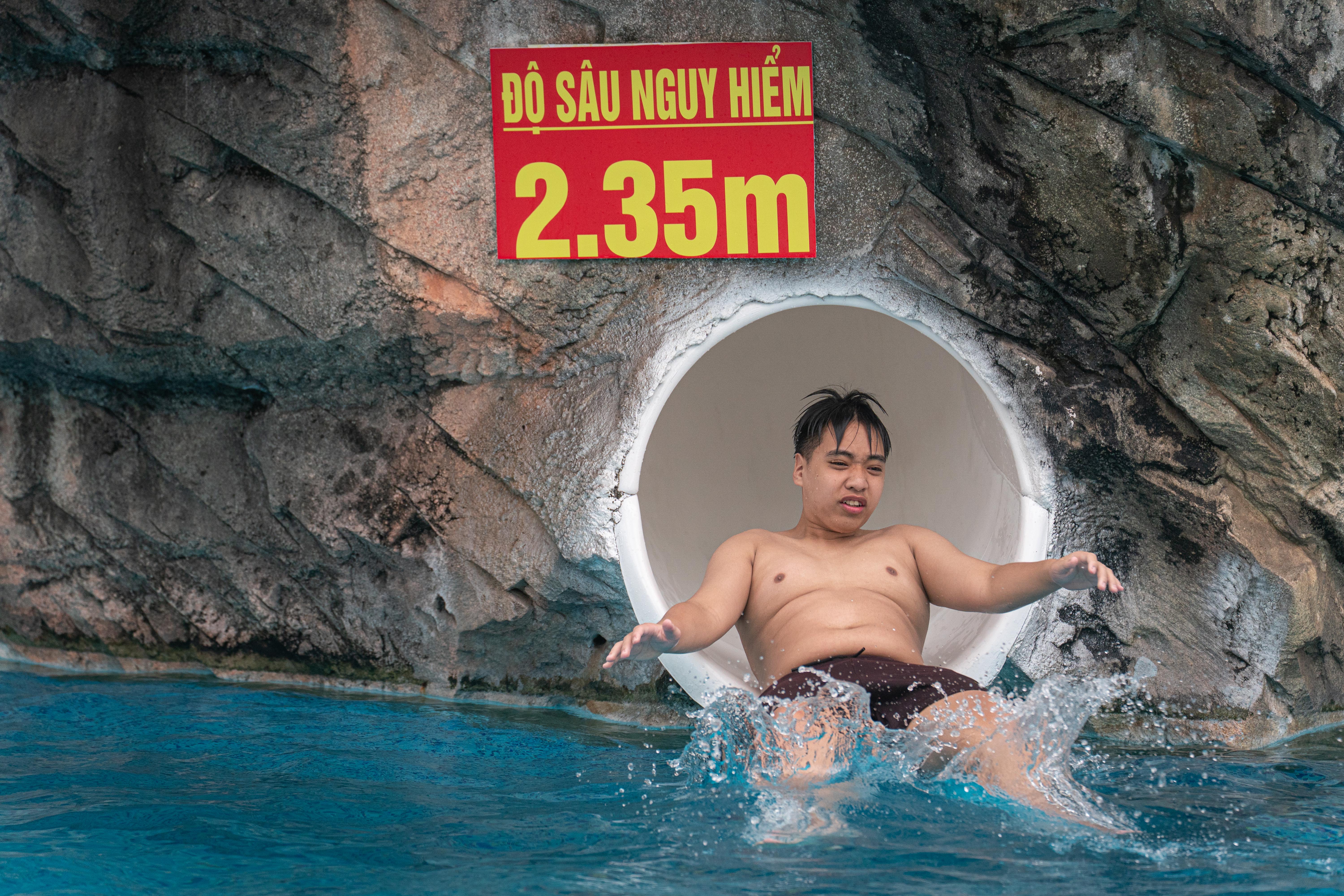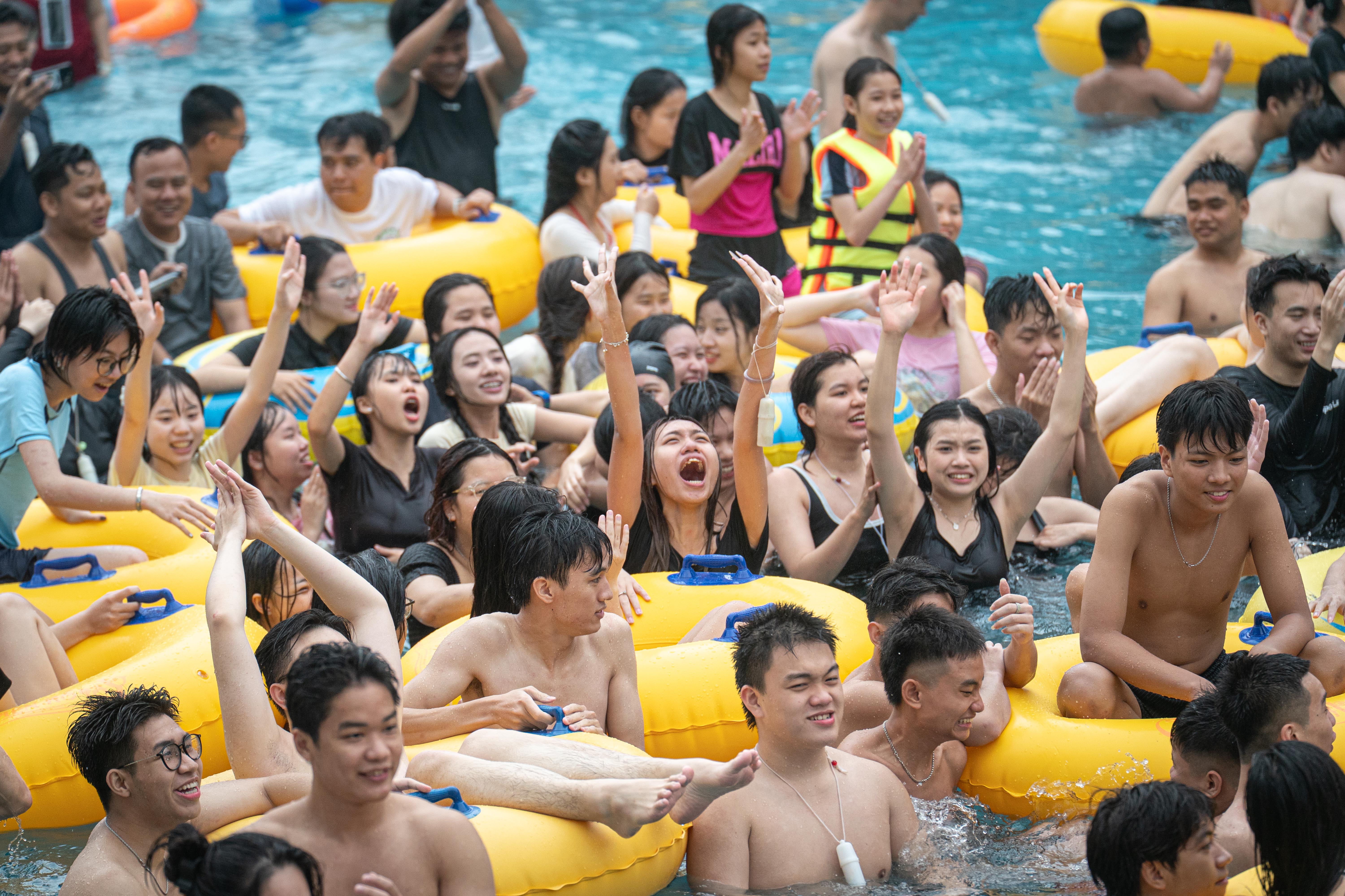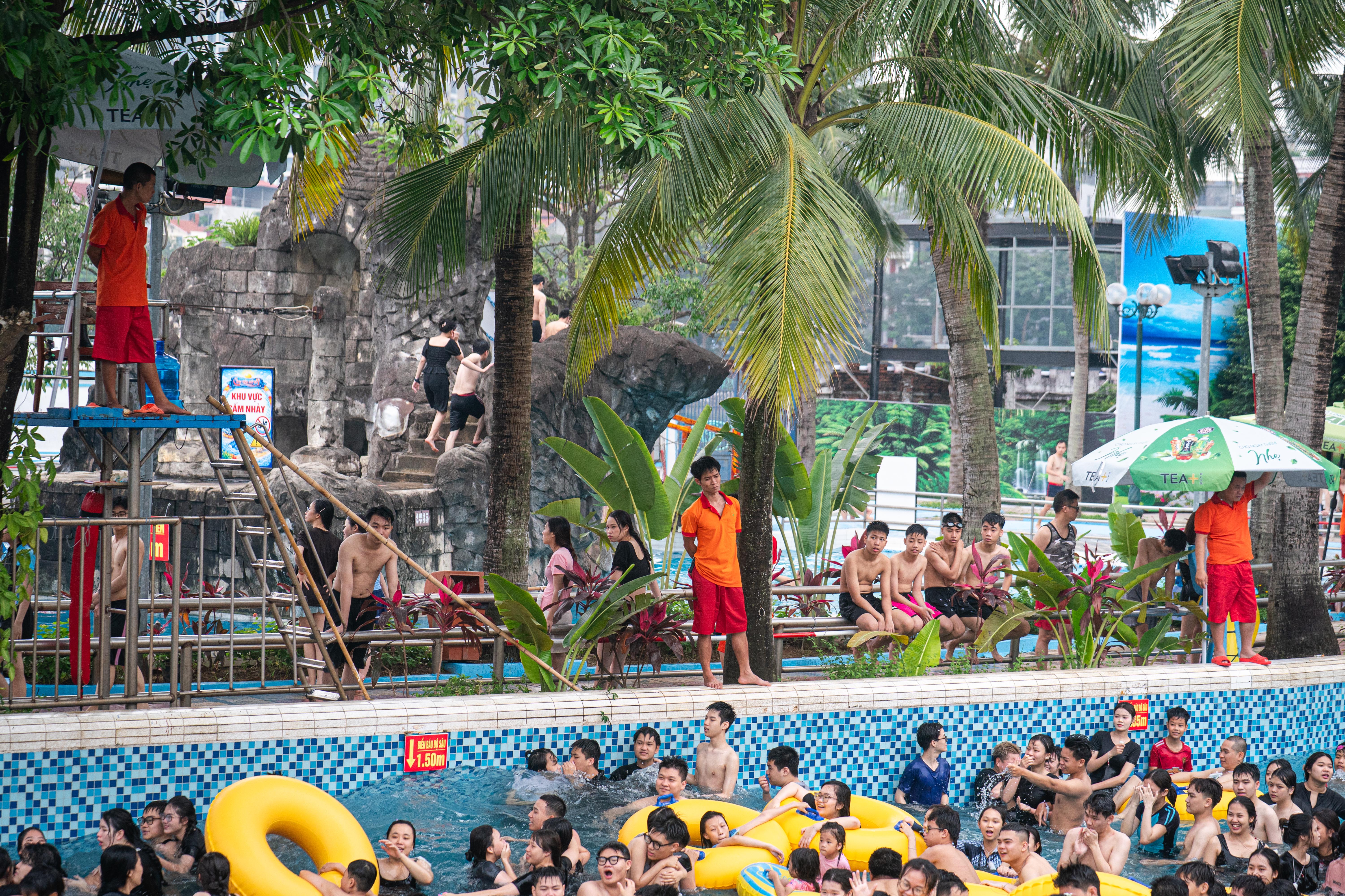 {"caption_all":"Many games attract hundreds of people lining up, with each turn waiting about 15 minutes, such as raft slides and water slides.nnA group of tam friends from Thanh Xuan ward came to West Lake because the price was reasonable on the opening day. With 98.000 dong, guests can use all services including: unlimited water games, free use of changing rooms, swimming floats, participation in minigames and enjoying all art programs during the day.nn"It's too crowded this year, each game can only be played once", said Hoai Anh, 21.","caption_items":"["",""]"}
