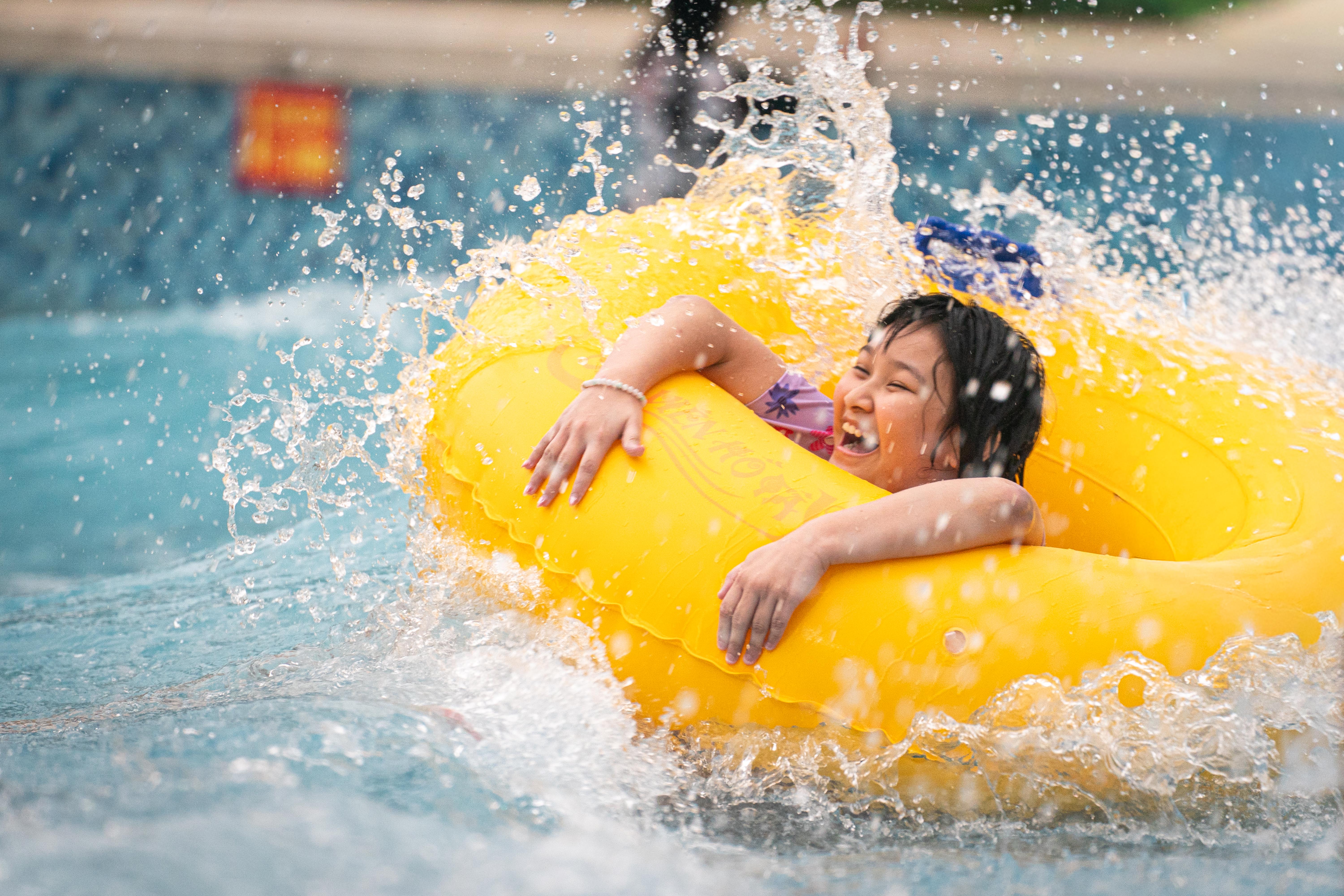 Many children use floats when participating in games in the wave pool area. |