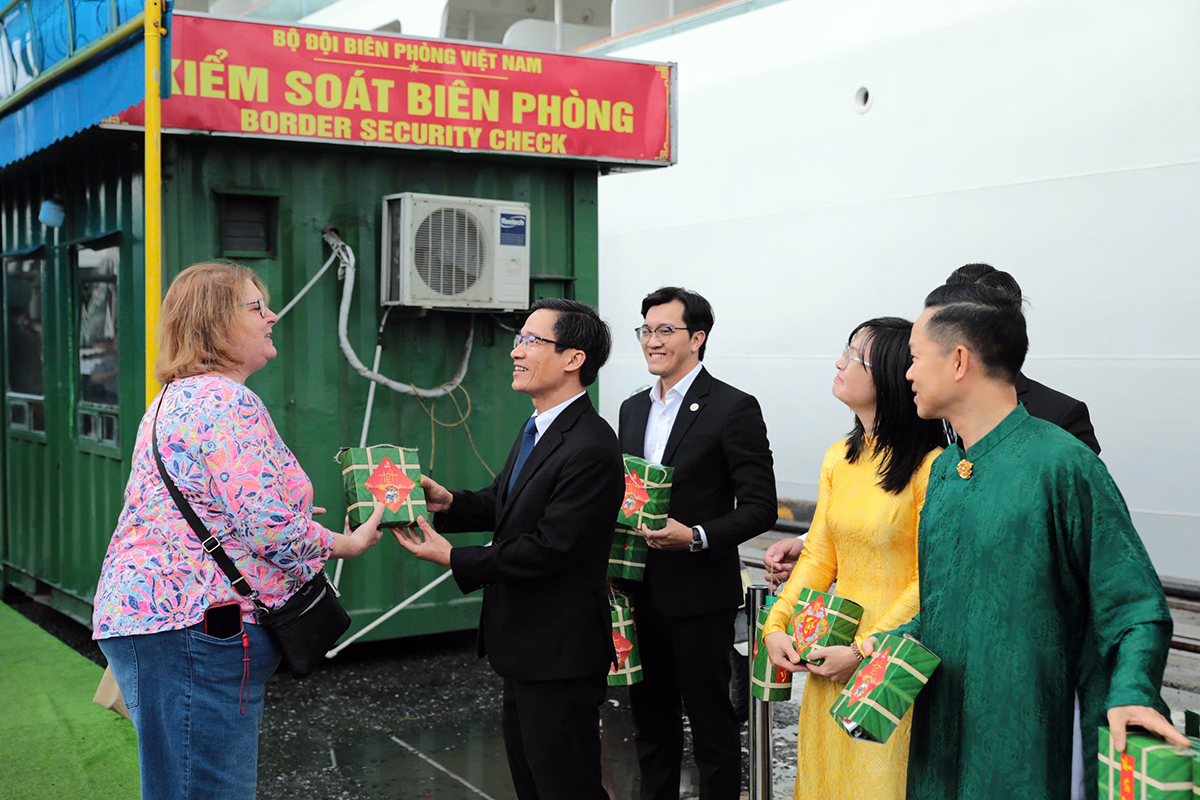 The ship carried 580 passengers from the United Kingdom, France, and the United States, along with approximately 500 crew members. Upon arrival, a vibrant welcome awaited the guests, featuring a lion dance, traditional conical hats (non la), and Tet gift boxes containing banh chung and banh tet, traditional Vietnamese sticky rice cakes.