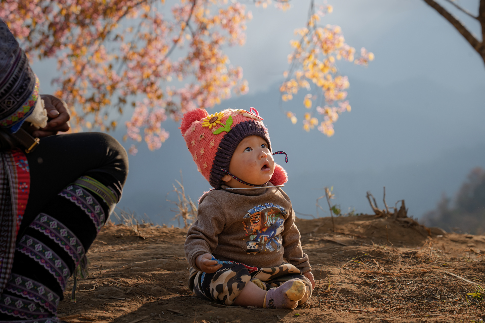 A H'Mong ethnic child sits in the yard of a house in Trong Tong village, beneath to day flower trees. Trong Tong village has a pristine landscape with many flower trees growing naturally amidst the hills. The village offers homestays and tourism services for visitors.