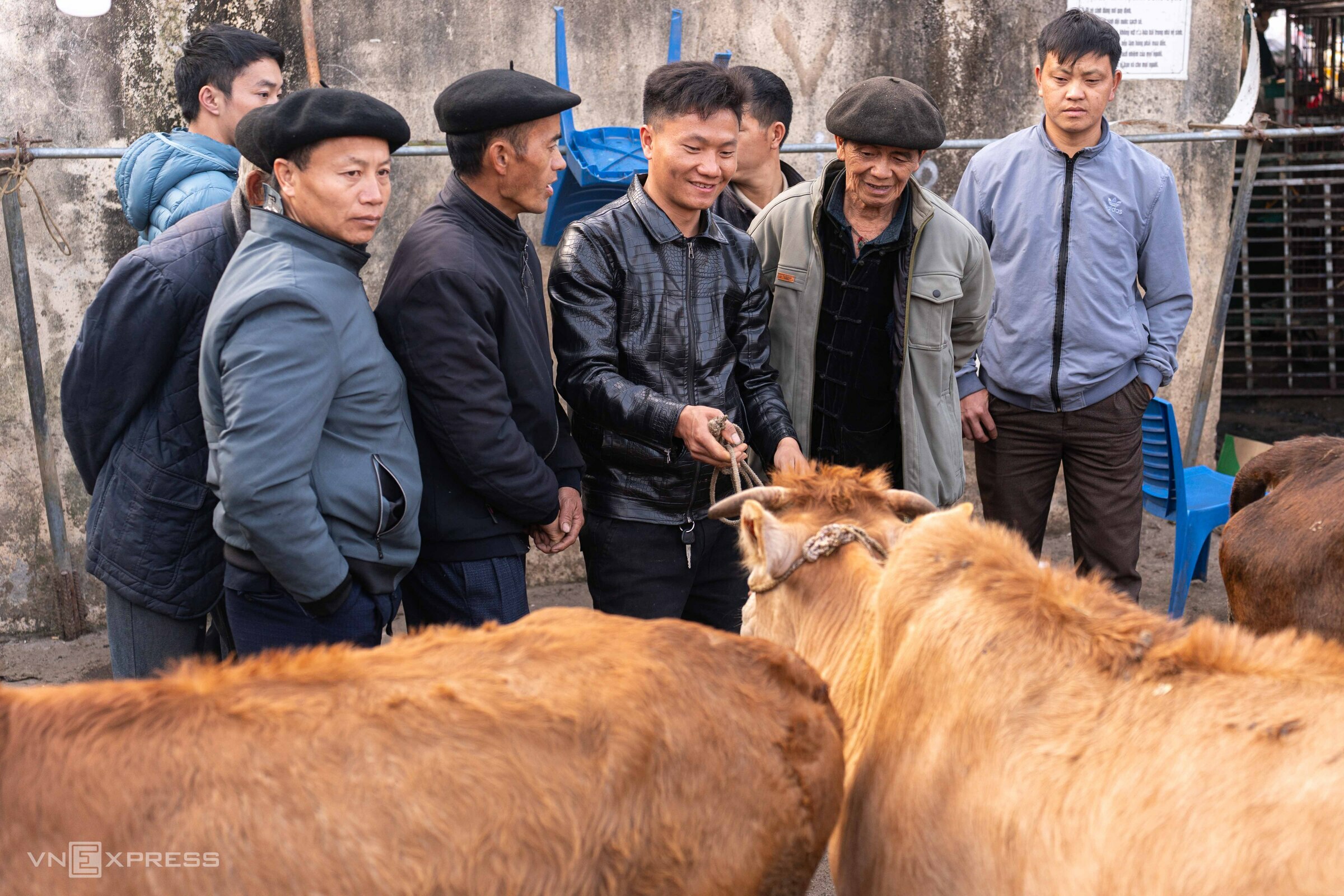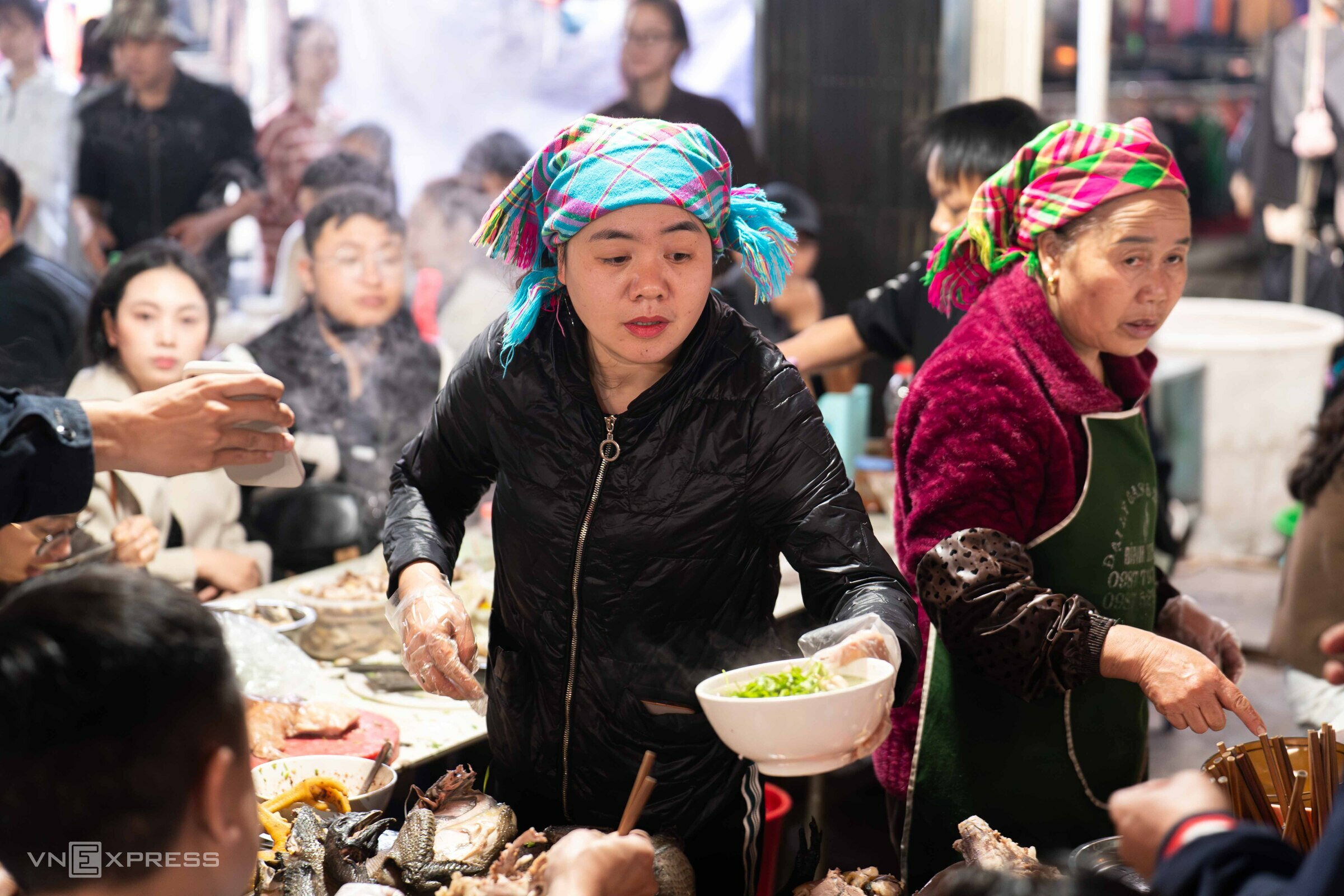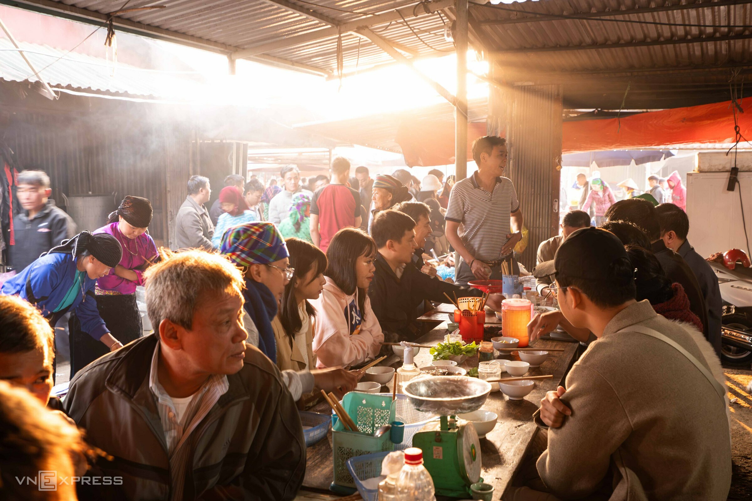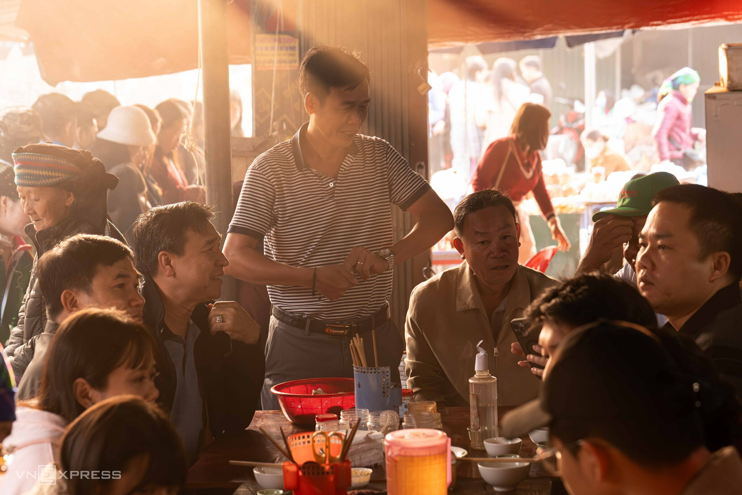 Minh Hoang, wearing a black shirt, from Hai Phong, stated that while the food wasn't to his taste, the market experience was "one of a kind". He was impressed by the dining area's "communal kitchen" atmosphere at the Dong Van market. "The light, the hazy smoke from the broth pots, and everyone gathering to eat breakfast felt like a big family feast," he said.