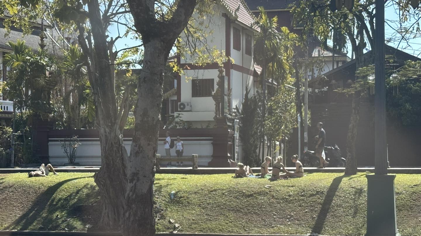 Foreign tourists in bikinis sitting and lying on the grass in front of a temple in Chiang Mai. Photo: Expose Chiang Mai V2 |