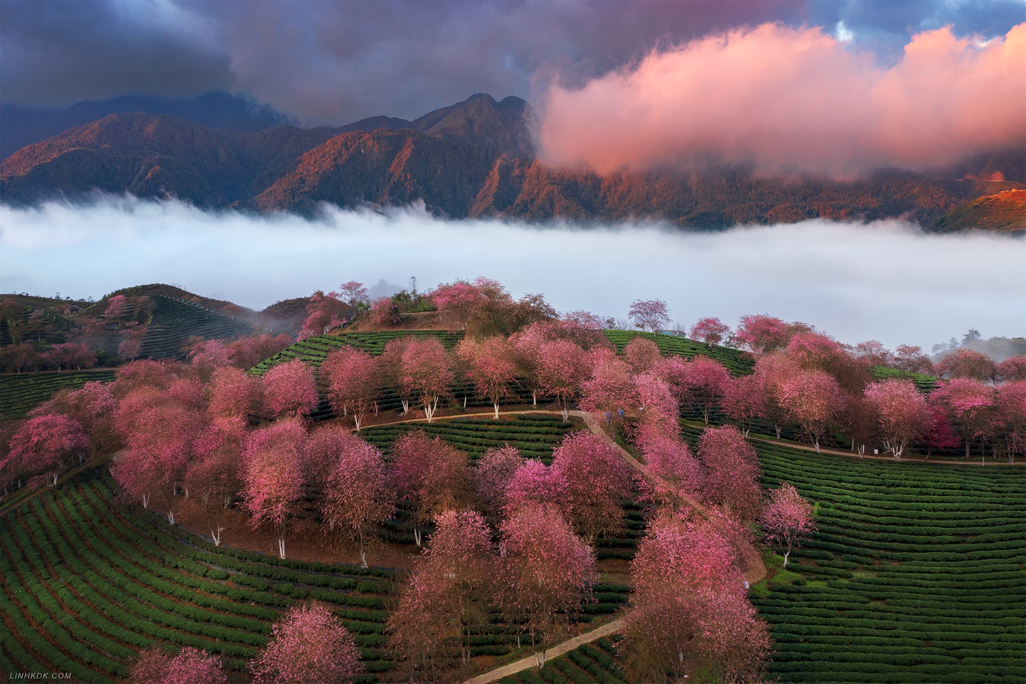 The cherry apricot tree planting area at O Quy Ho tea hill was managed by a land-leasing entity. Since 2020, it has become a popular destination for tourists visiting Sa Pa. Every December, cherry apricot trees bloom amidst the cool air of the Northwestern mountains, creating a captivating natural scene. Tourists often travel towards O Quy Ho Pass to admire the flowers and hunt for mist and clouds in the early morning.