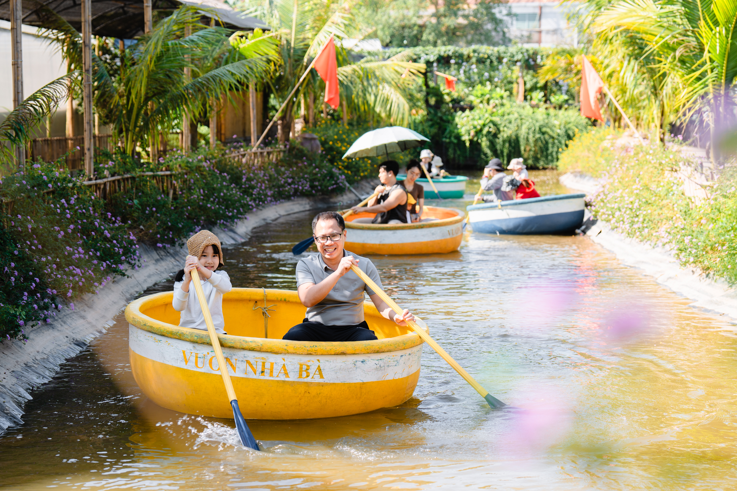 Vuon Nha Ba is more than just a scenic spot. Here, families and children immerse themselves in rural activities and agricultural culture. A prominent activity involves learning to paddle a basket boat.