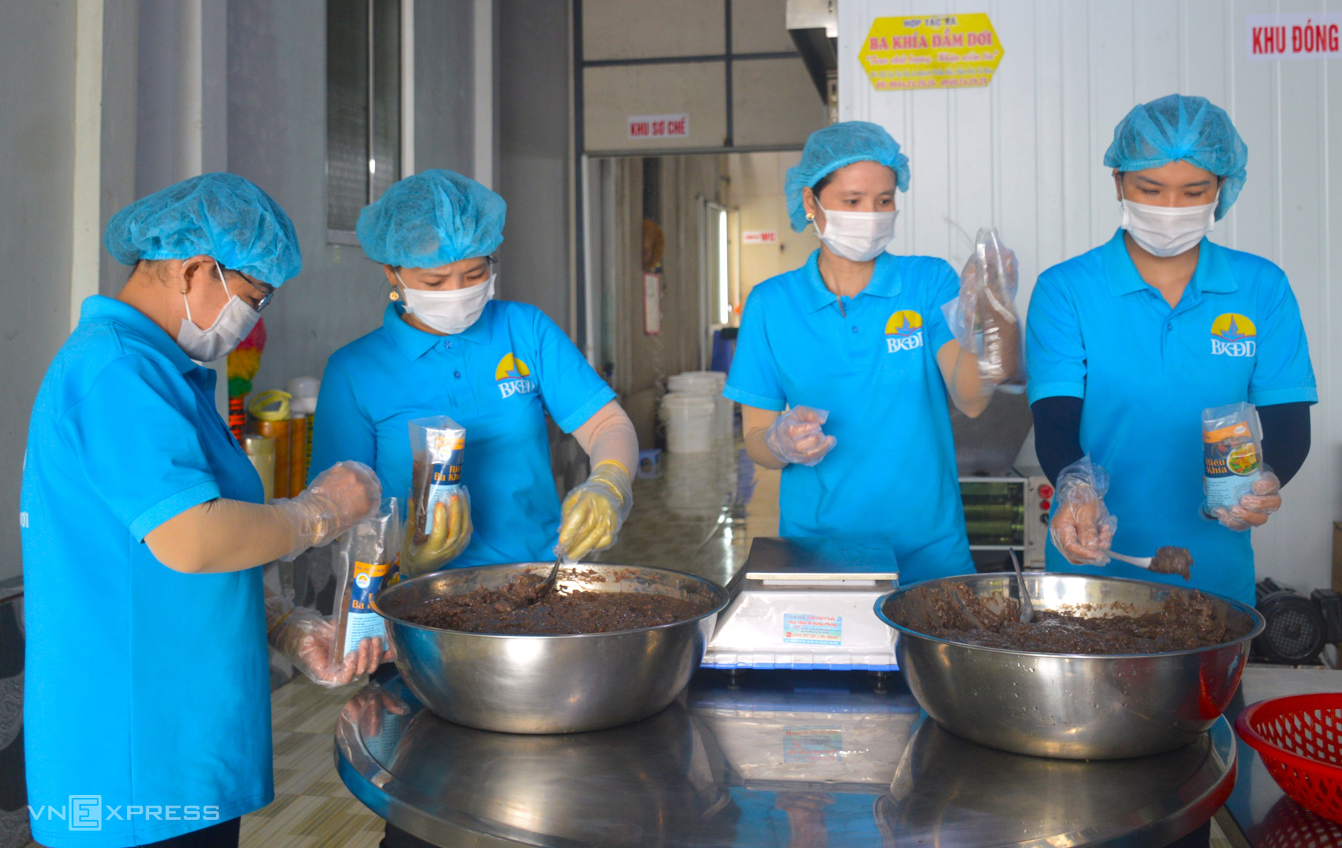 After initial processing, staff separate the ba khia meat to maintain its freshness. The ba khia are then ground into *rieu* and packaged to ensure food safety.