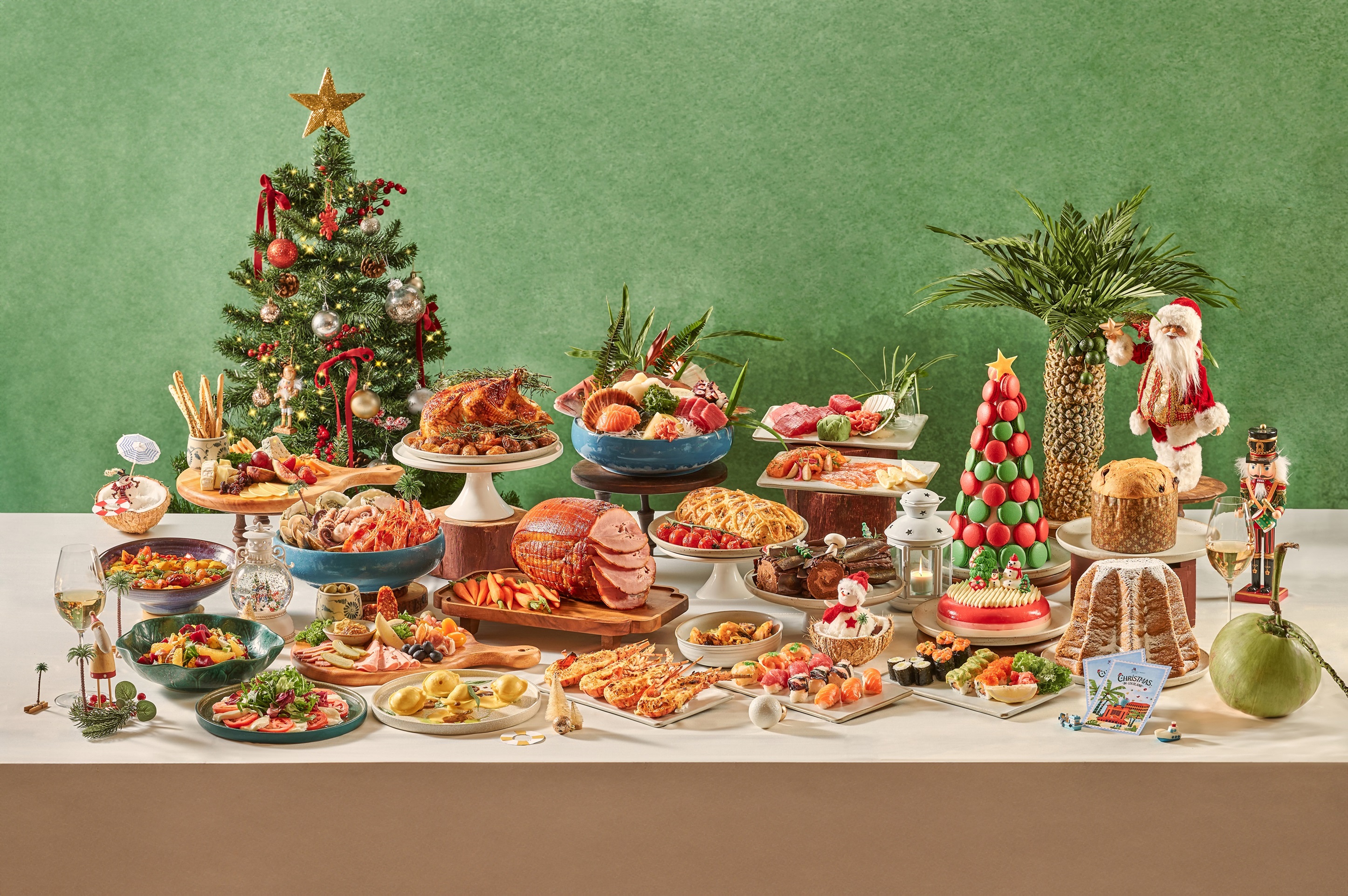 Goji Kitchen & Bar, located within the resort, offers a special menu for the festive season. The dining area is adorned with christmas decorations, including fairy lights and a christmas tree. Guests enjoying the buffet on christmas eve and new year's eve can savor an extensive culinary feast featuring asian and european dishes. Highlights include: whole roasted turkey, cured ham, and wagyu beef wellington. Additionally, fresh seafood caught daily, such as lobster, sashimi, and sushi, will be available, alongside traditional christmas desserts like yule log cake and pandoro sponge cake.