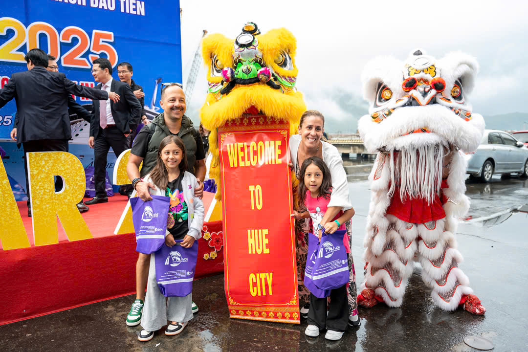 International visitors take photos with a lion dance troupe upon arriving in Hue. Photo: Vo Thanh