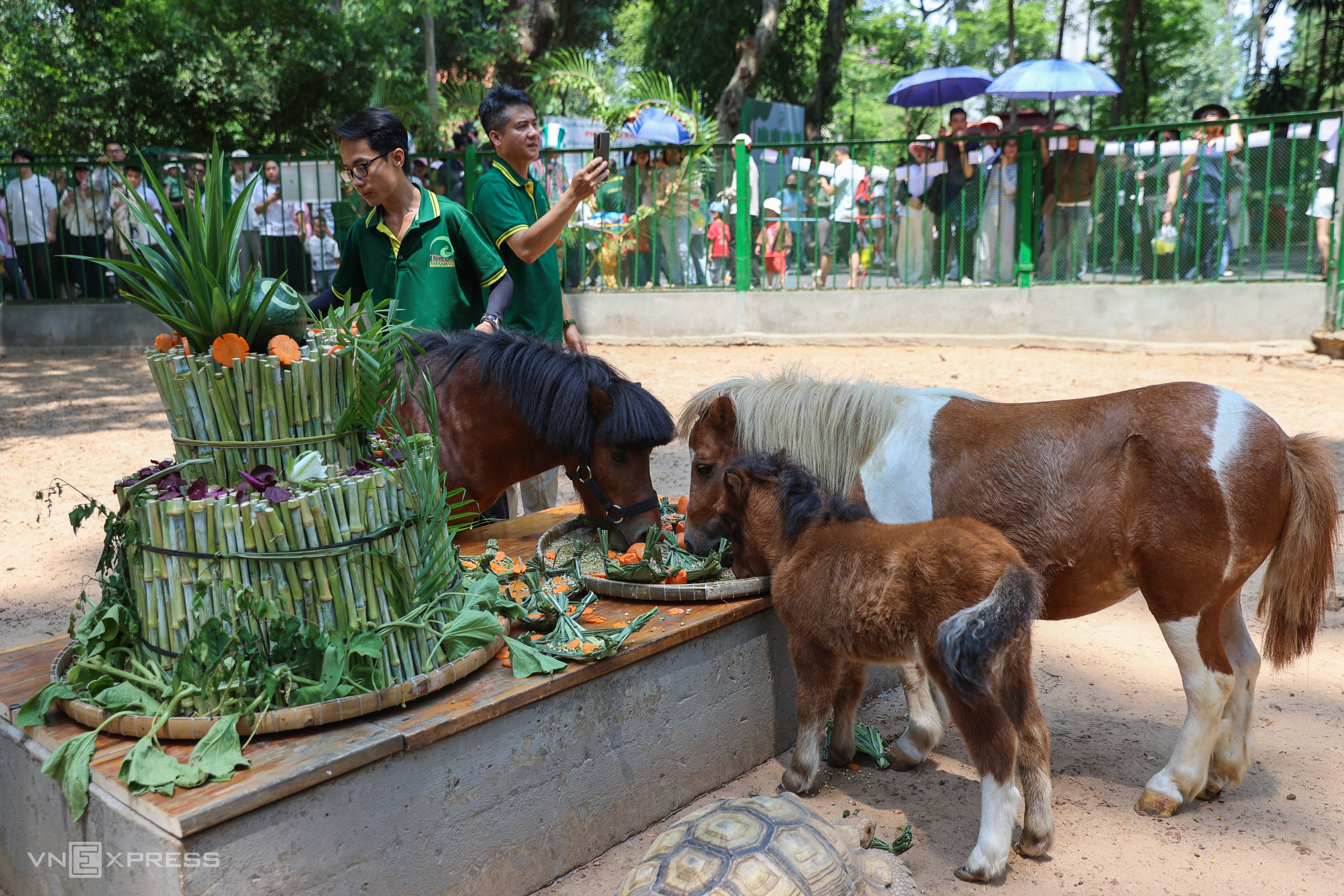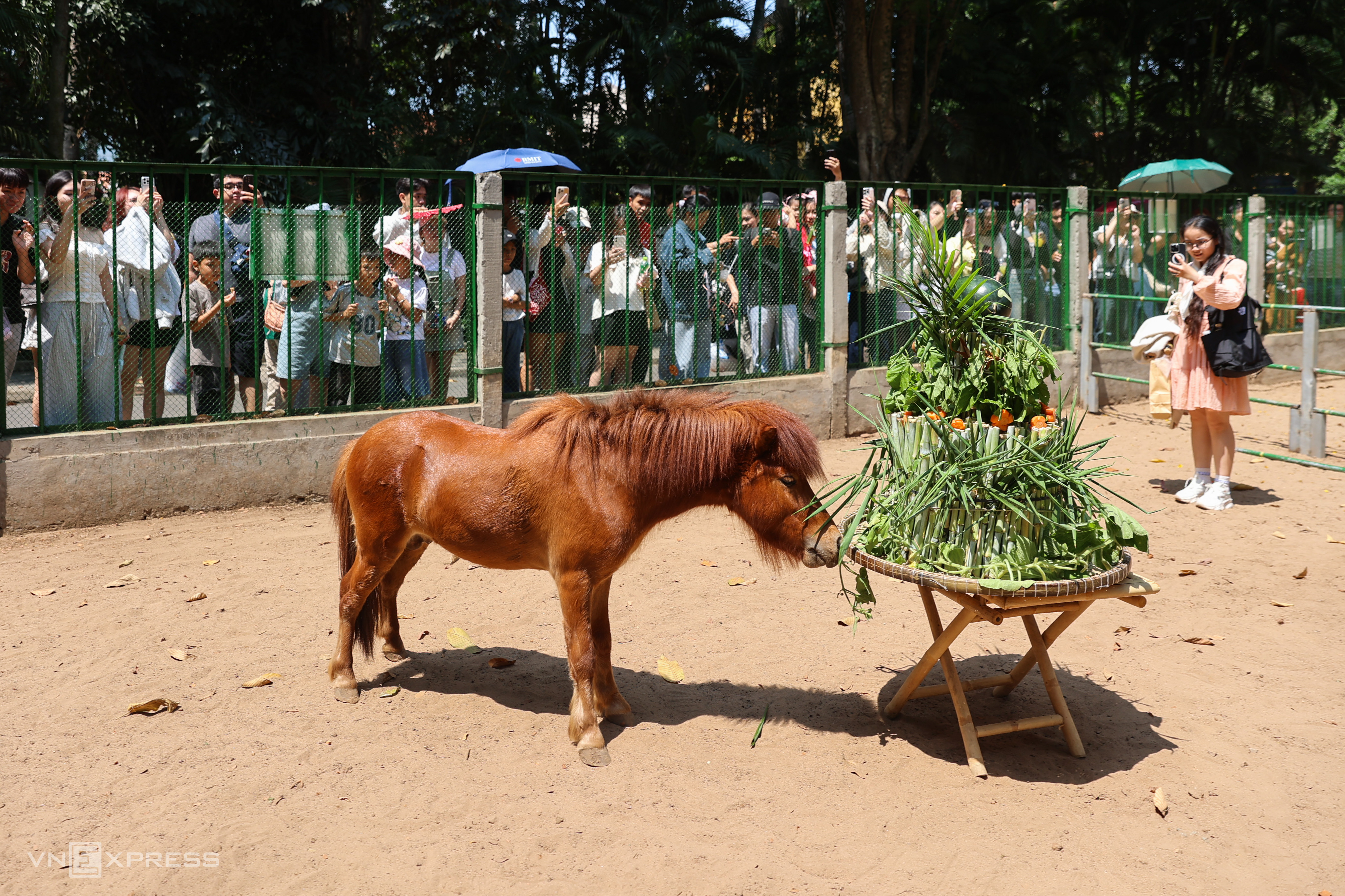 Saigon Zoo and Botanical Garden staff prepared a birthday cake along with food made from vegetables and roots. The cake display area attracted many visitors for "check-ins". Pham Hoang Quynh Anh, a hoof care technician, stated that "pony" is a general term for horse breeds with a height under 1,47 m that have been domesticated. Ponies eat roots but can also be supplemented with vegetables such as carrots, apples, and corn. However, due to their susceptibility to obesity, their diet needs to be controlled.