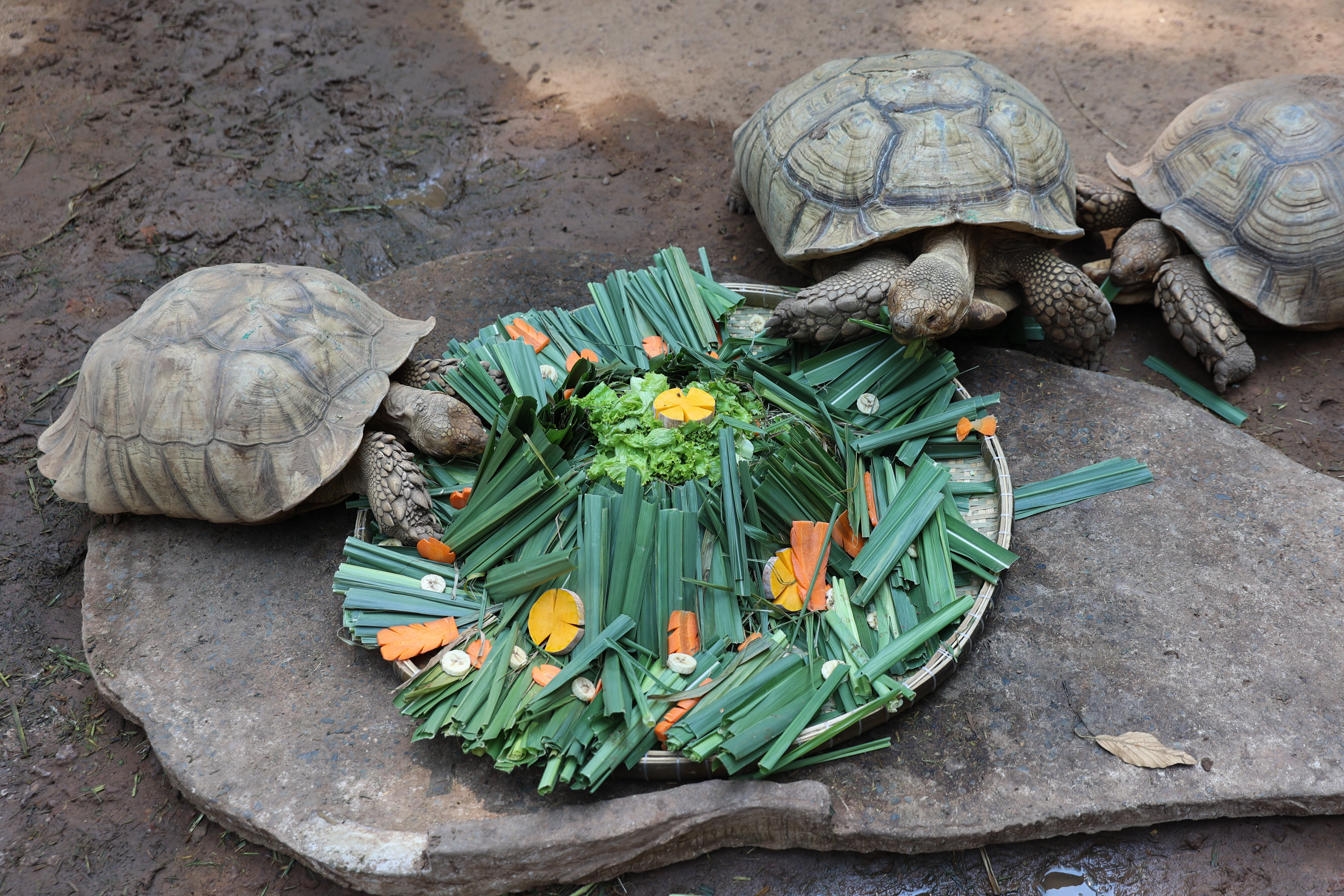 The Sulcata tortoise family, "neighbors" sharing the enclosure with the pony family, also joined in the celebration.