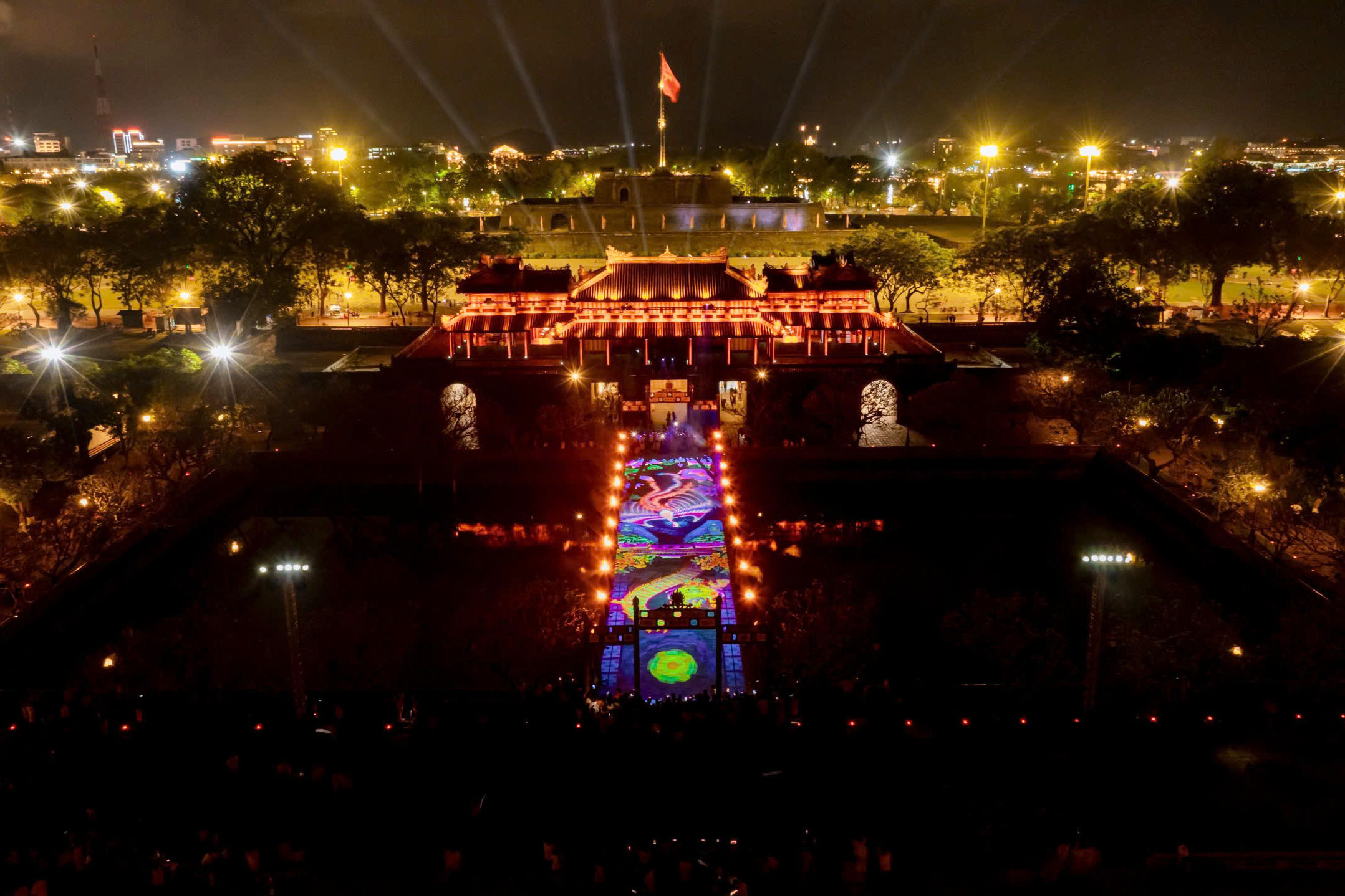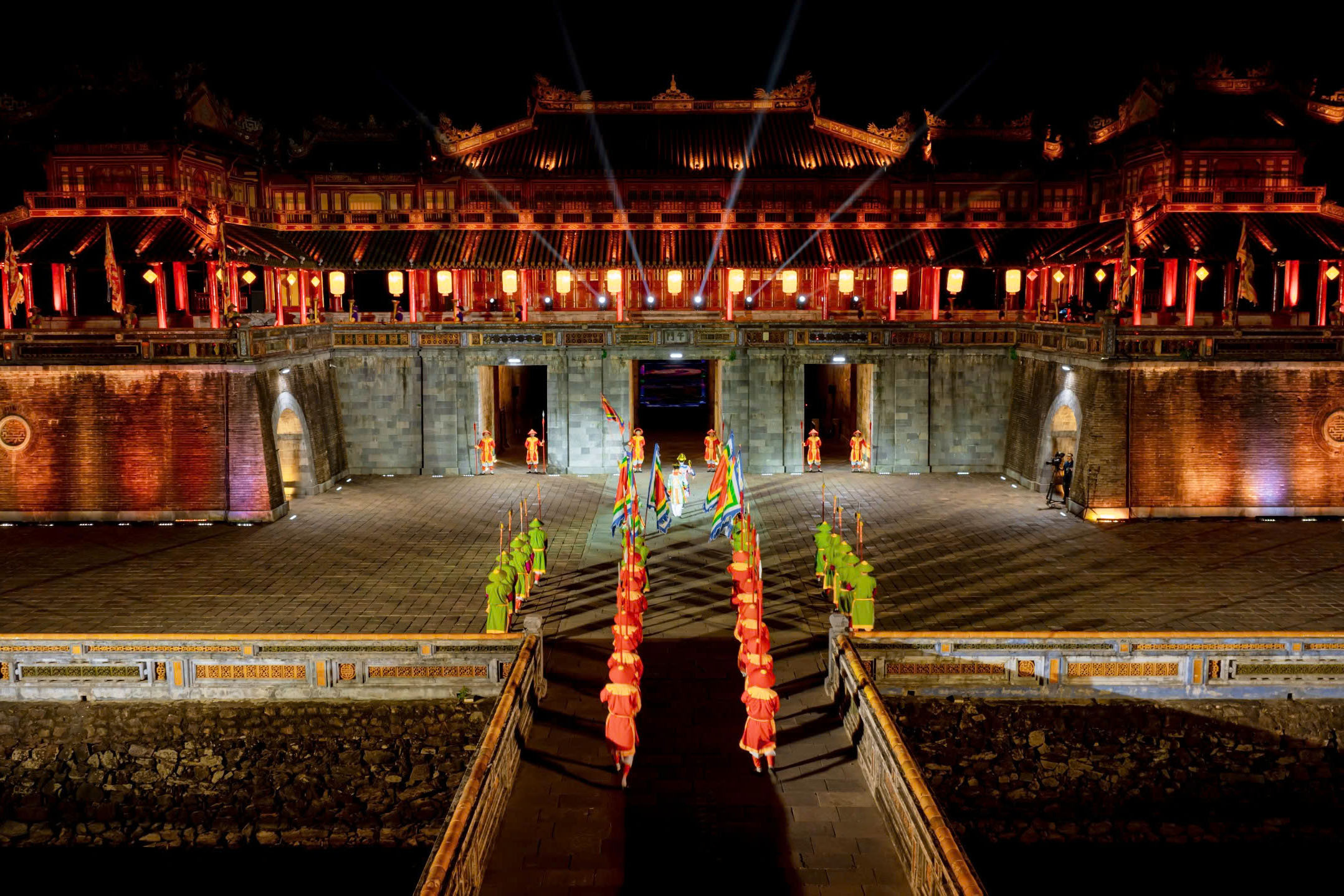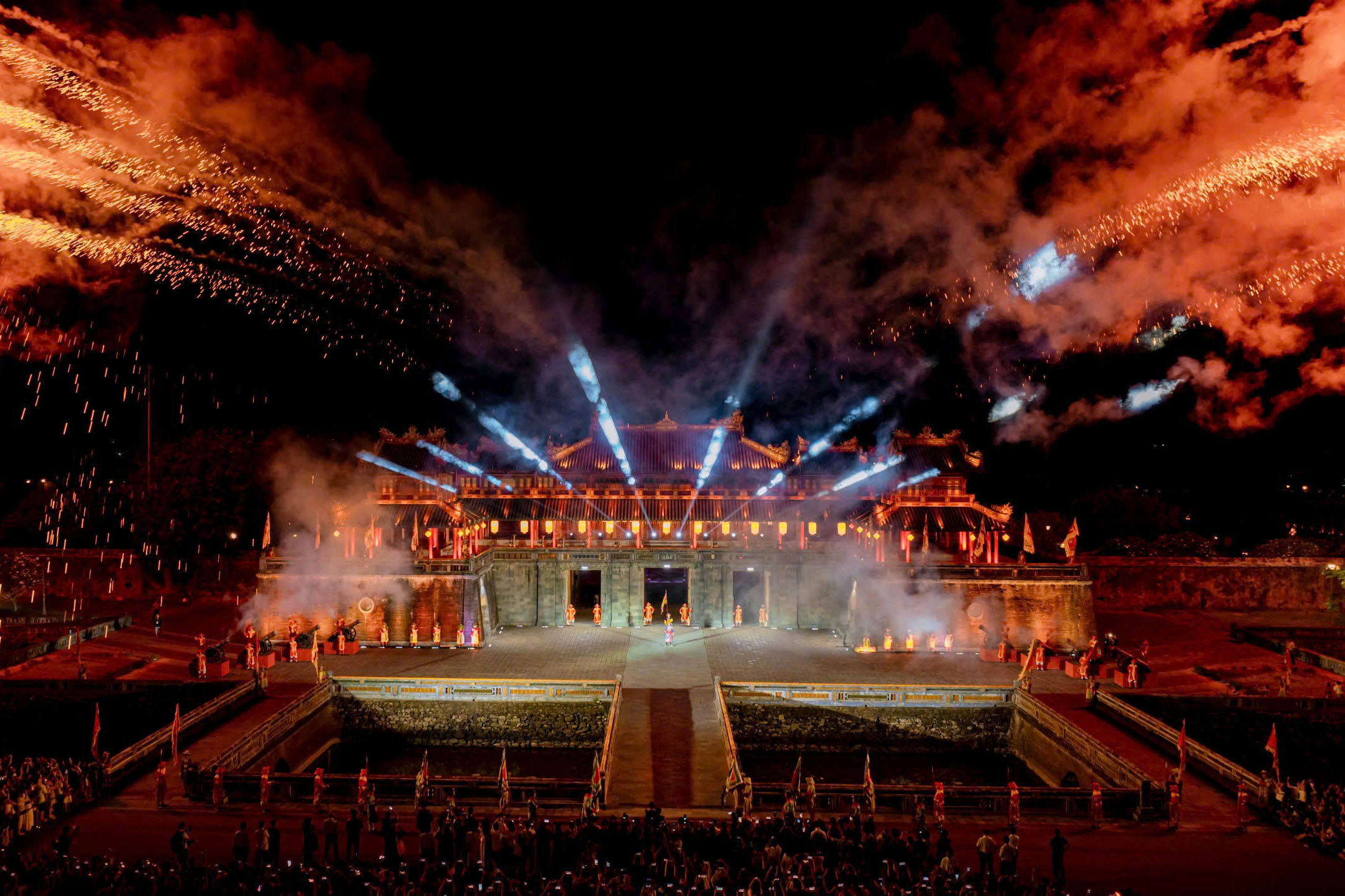 The program began with the Hue Monuments Conservation Center reenacting the Nguyen Dynasty change of guard ritual at Ngo Mon Gate, combined with cannon fire effects.