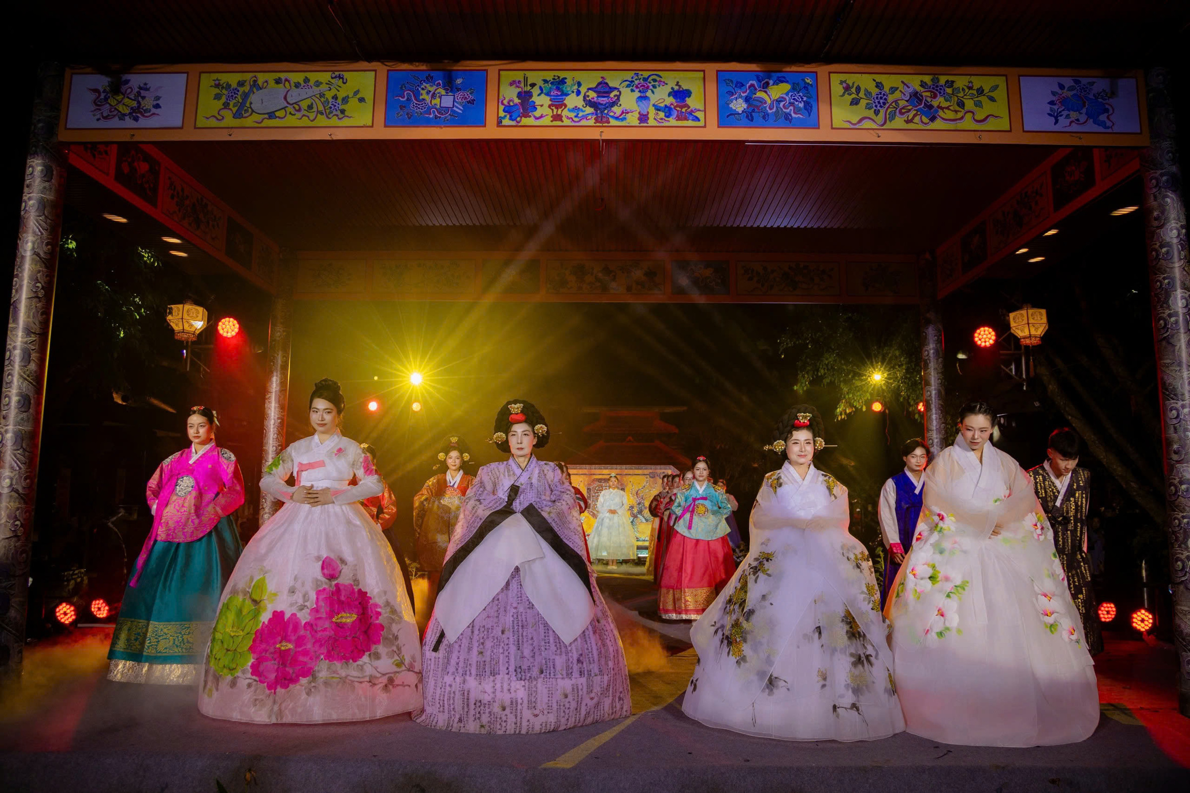 Trung Dao Bridge, connecting Ngo Mon Gate to Thai Hoa Palace, glowed with torches and 3D mapping of imperial patterns. On both sides of the bridge, performers portrayed court ladies dancing with lanterns.