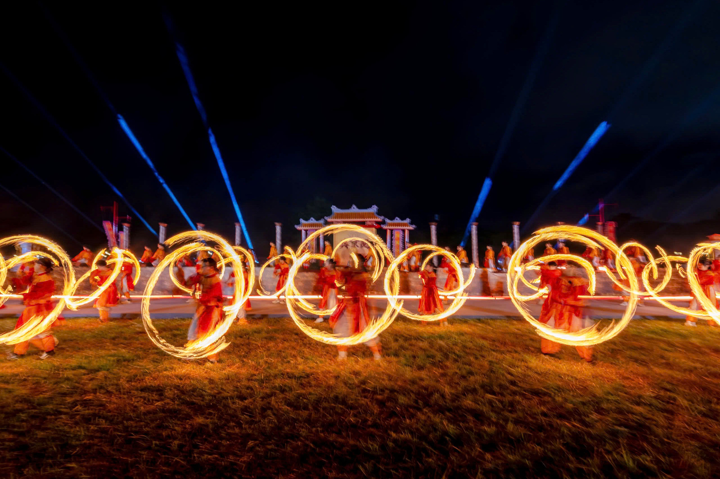 The military parade and drills east of Thai Hoa Palace reenacted the spirit of the Nguyen Dynasty army, featuring: flag dances, staff dances, spear and shield drills, and archery combined with fire effects.