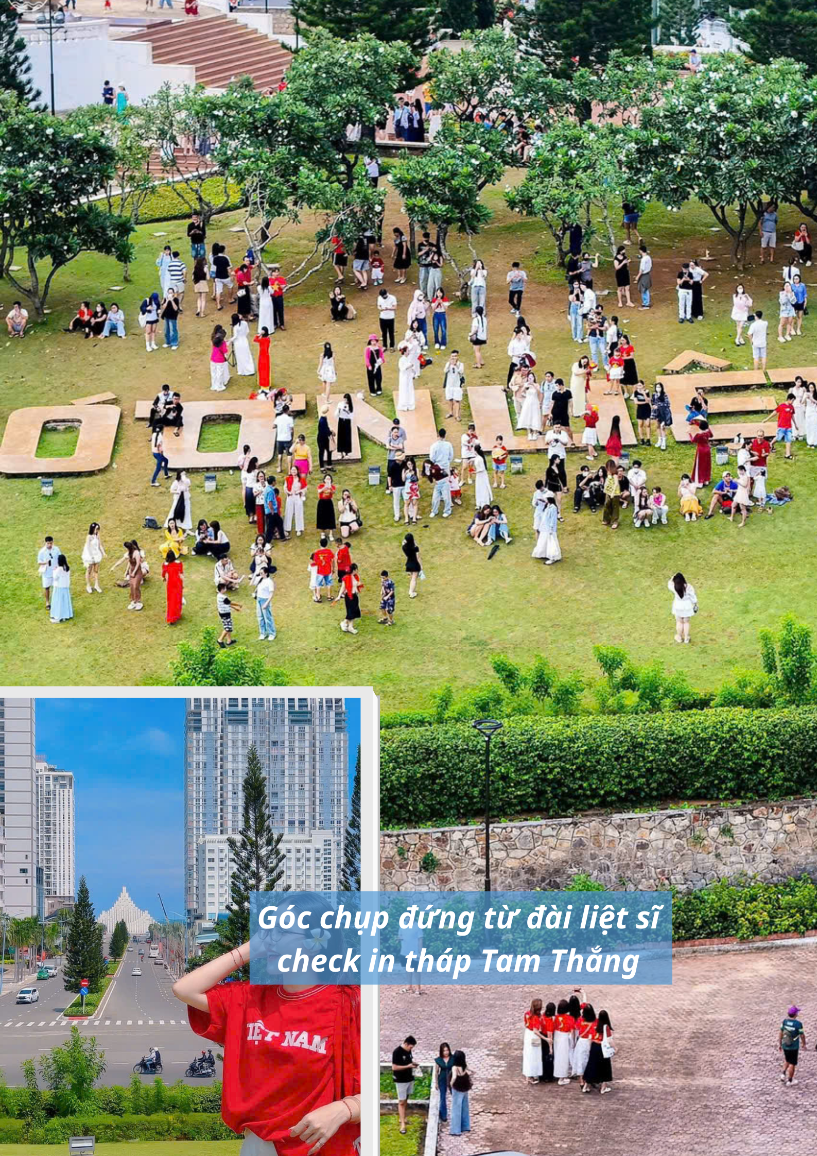 Tourists standing at the martyrs' memorial to take photos of Tam Thang tower in the distance. Photo: Vung Tau Ward People's Committee. |