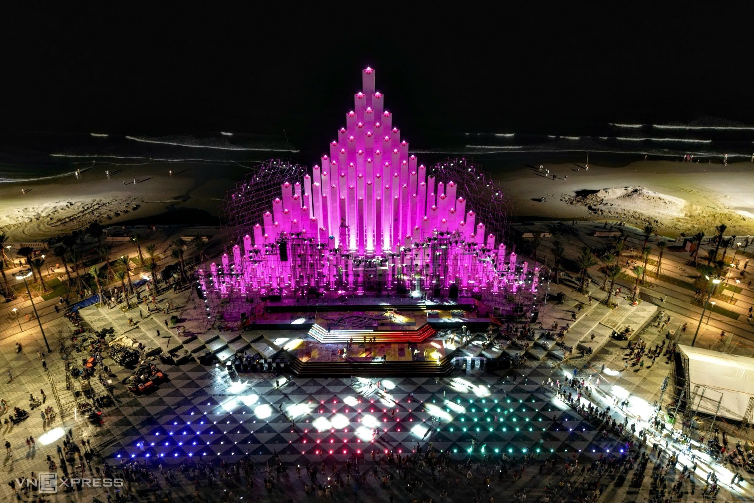 Tam Thang tower illuminated with changing colors on the shore of Back Beach. Photo: Truong Ha |