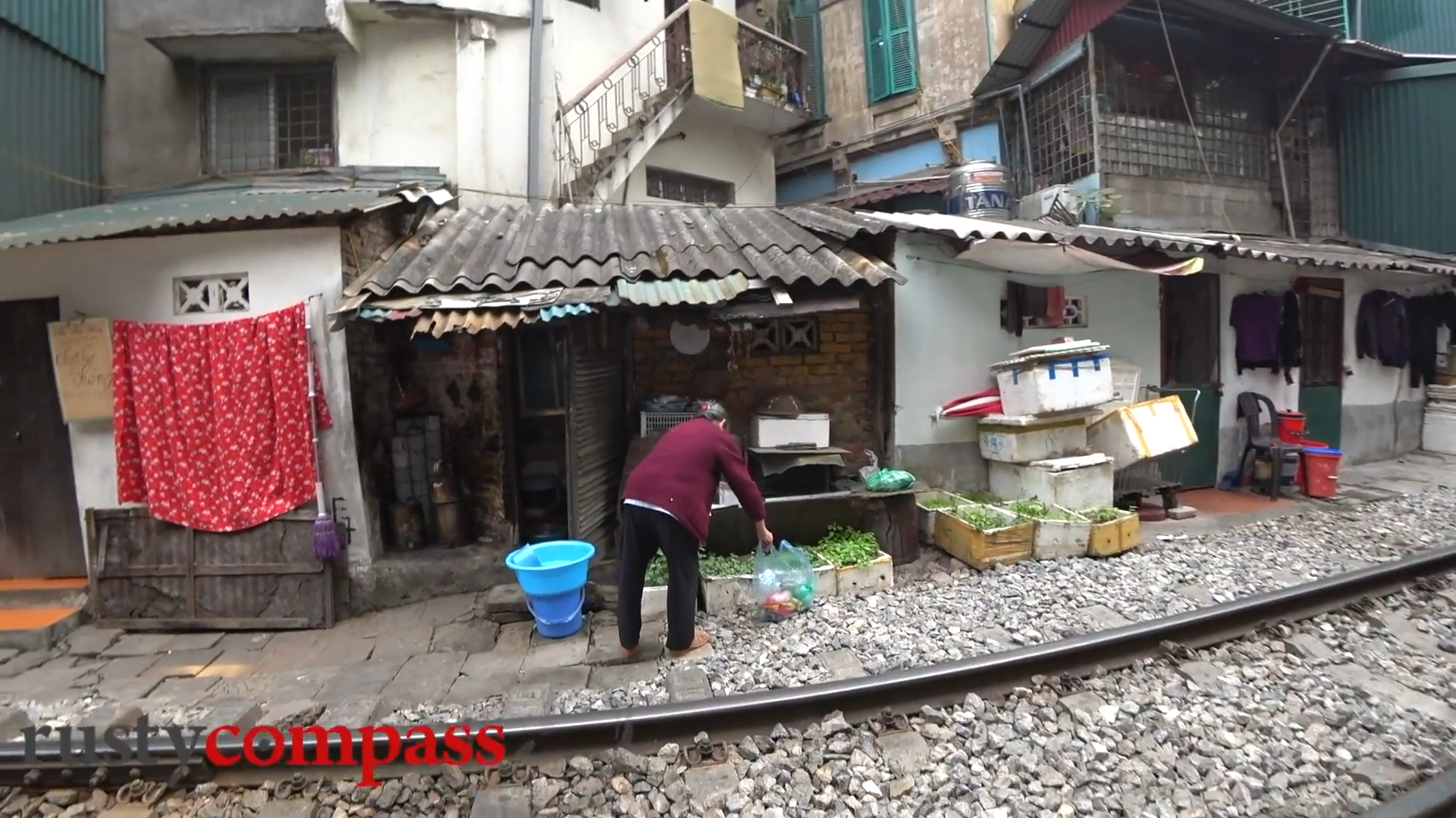 A woman displays personal items on Train Street in 2017. Photo: Rusty Compass