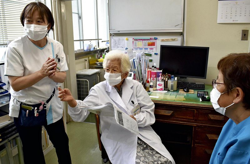 Kasamatsu (center) works at Kasamatsu Hospital in Kainan, Wakayama, on 5/9. Photo: Yomiuri |
