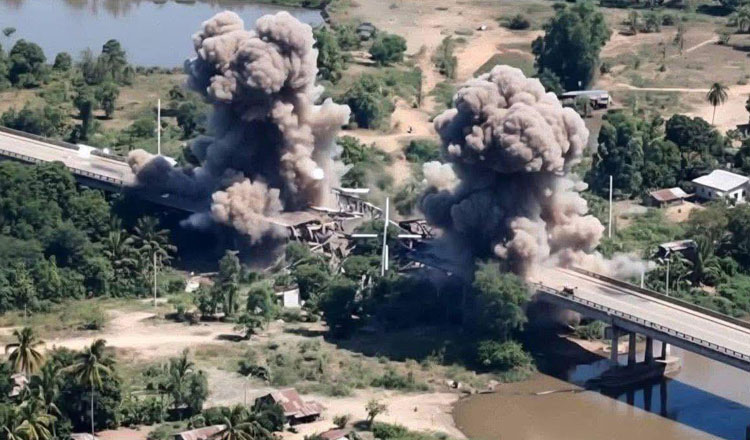 One bridge span completely collapsed after a Thai air strike. Khmer Times.