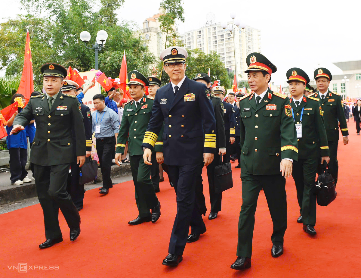 Vietnamese and Chinese Defense Ministers at an exchange in Mong Cai on 18/3. Photo: Son Ha
