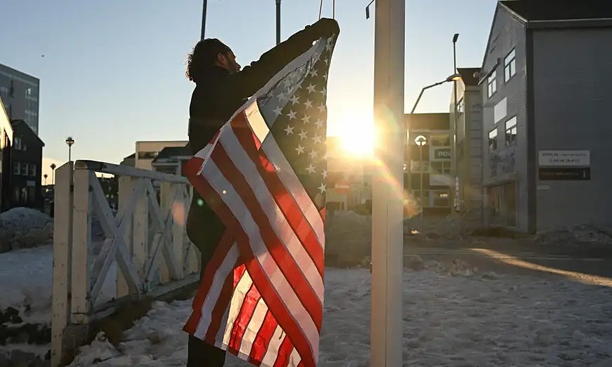 Comedian Maxi Schafroth attempting to raise a US flag in front of the Nuuk cultural center on 28/1. Photo: AFP |