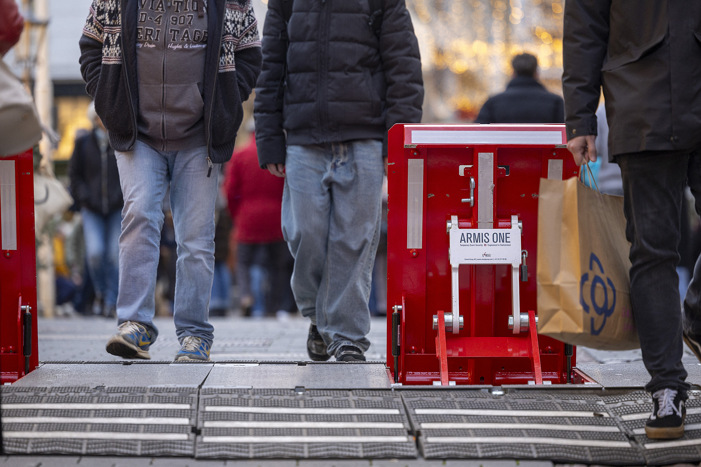 Steel plates that can be raised and lowered to prevent trucks from ramming into crowds at the Bonn christmas market on 16/12. Photo: AFP |