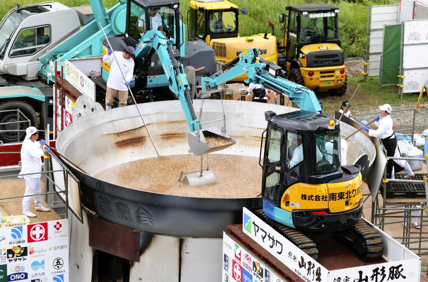 The 6.5-meter diameter pot was used to cook 3.2 tons of taro, 1.2 tons of beef, 3,500 leeks, and 4,000 pieces of konjac jelly. The broth was seasoned with soy sauce, sake, and sugar, then mixed with an excavator equipped with a specialized bucket.