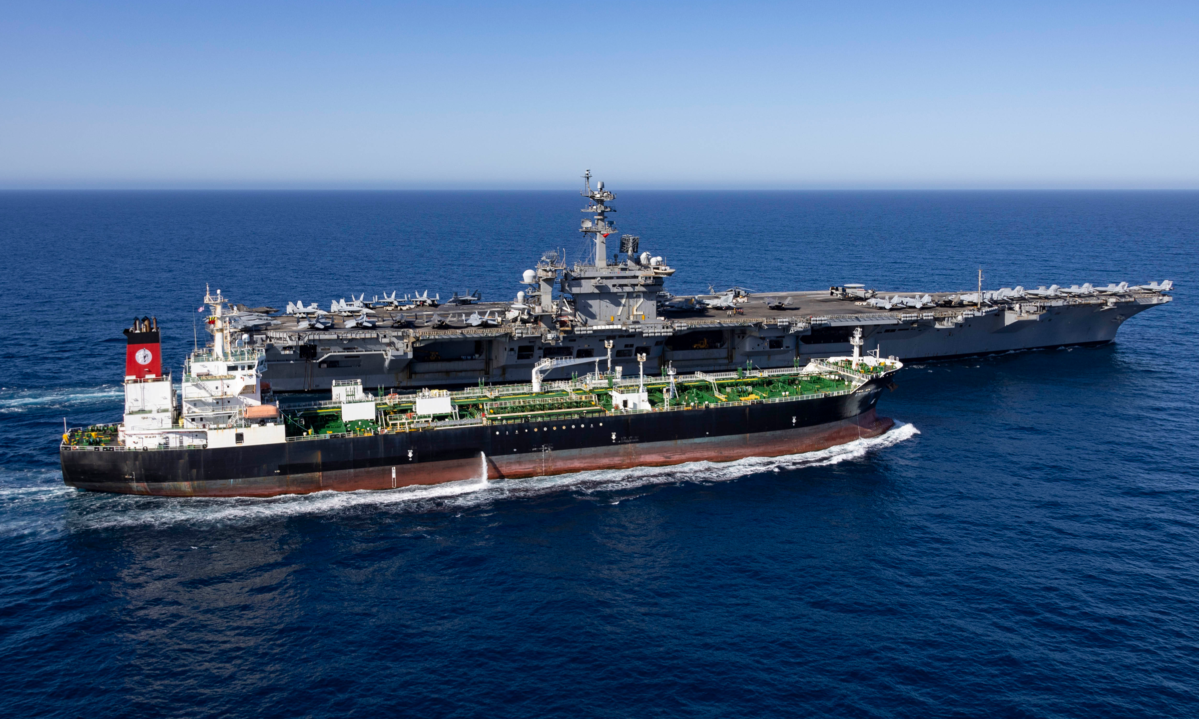 Despite carrying over 11 million liters of JP-5, the USS Lincoln can quickly deplete its aviation fuel during high-intensity aircraft operations. To avoid returning to port, the USS Abraham Lincoln is refueled at sea by oil tankers.