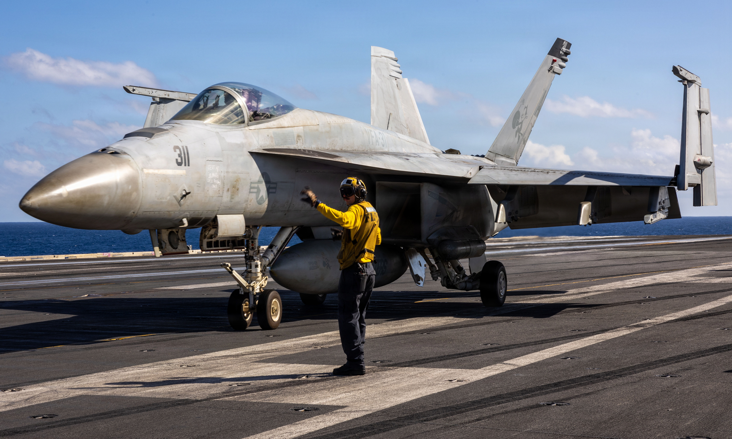 An F/A-18E Super Hornet moving on the flight deck of the USS Gerald R. Ford in the Caribbean Sea on january 30.