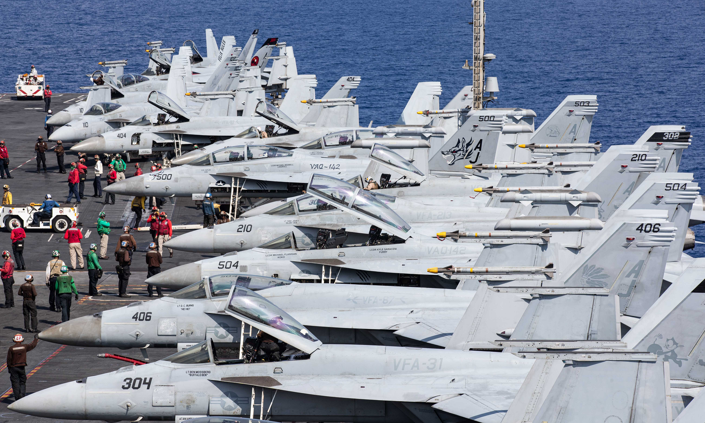 The primary offensive capability of the USS Gerald R. Ford comes from its four F/A-18E/F fighter squadrons. This aircraft model can carry various guided bombs, rockets, anti-ship, and air-to-air missiles. Additionally, it carries EA-18G electronic warfare aircraft and utility helicopters.