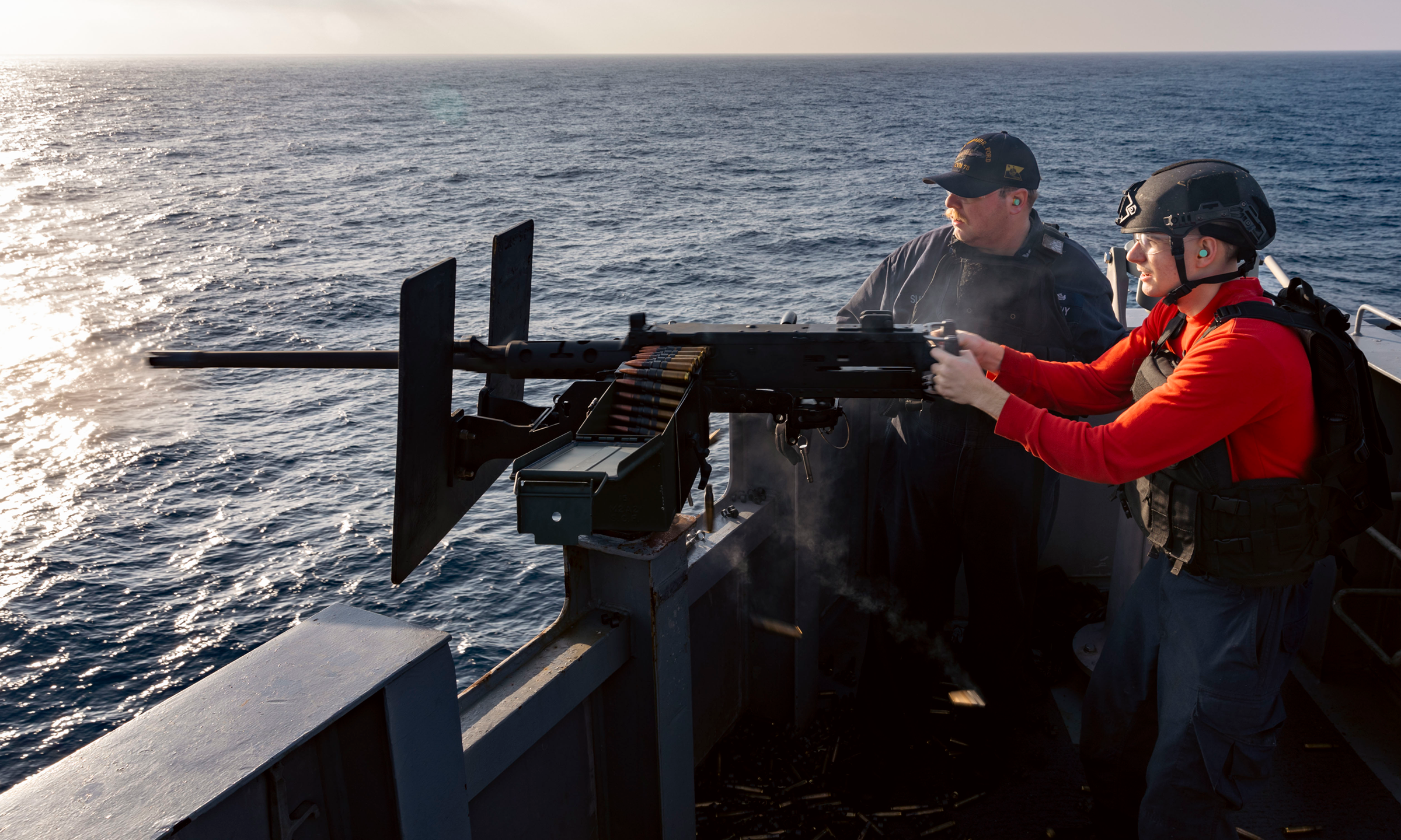 To counter small boats, the USS Gerald R. Ford is equipped with 12,7 mm caliber machine guns and 25 mm autocannons.