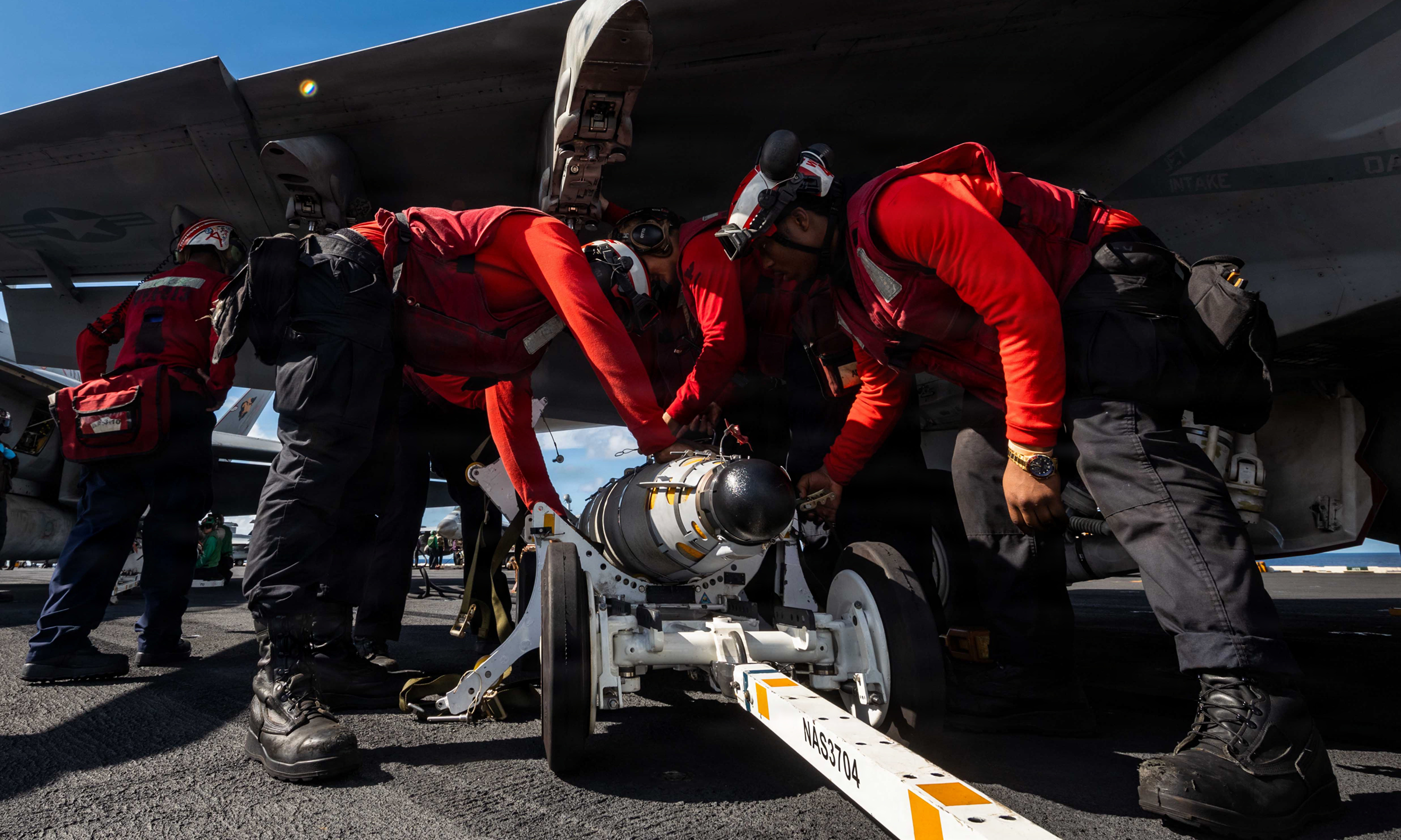 Technicians preparing to load a GBU-54 guided bomb onto a Super Hornet fighter jet. F/A-18E/F squadrons can carry 225, 450, and 900 kg bombs. They can be equipped with laser or GPS satellite guidance kits for increased precision during strikes.