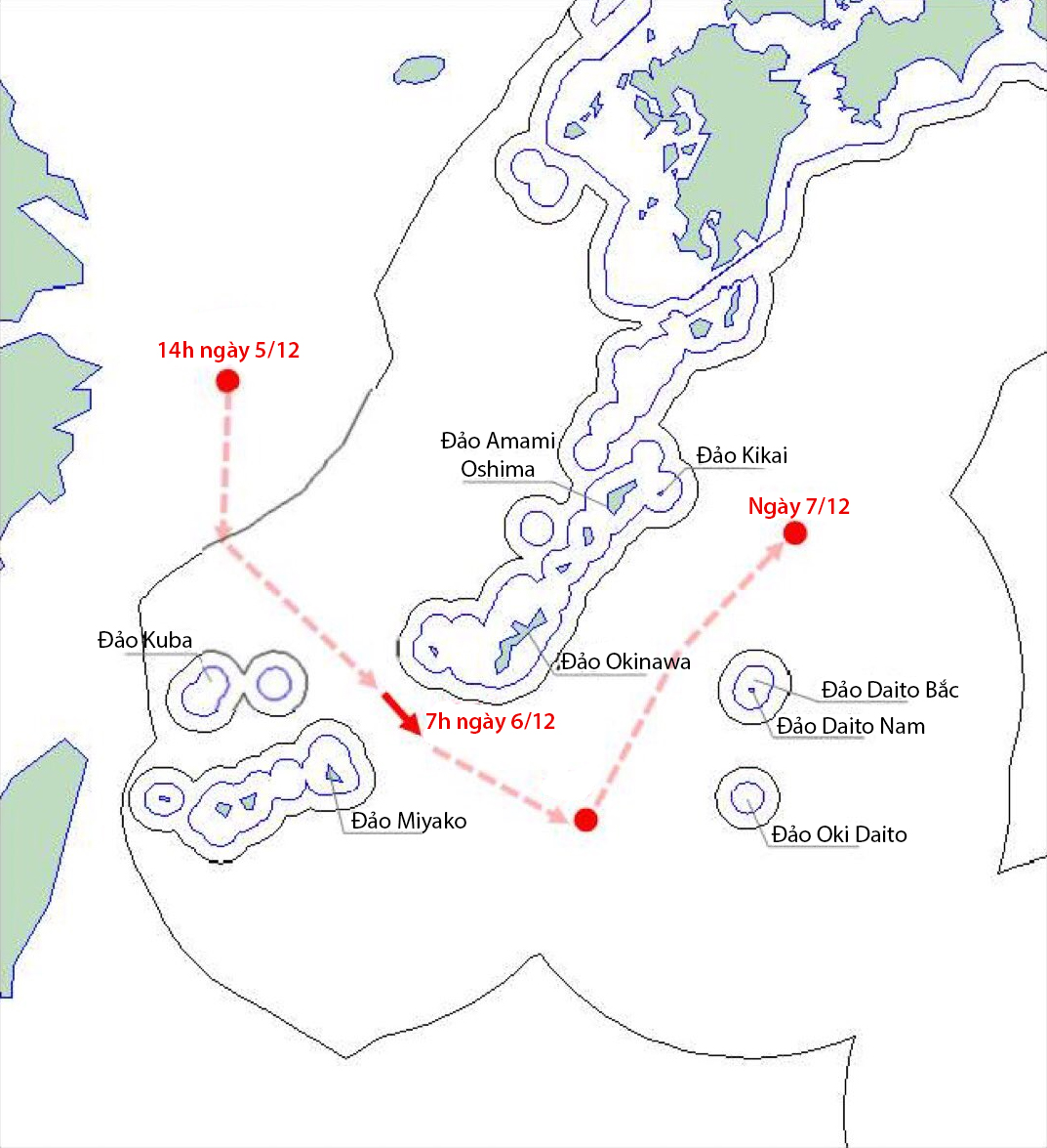 Movement direction and position of the Liaoning aircraft carrier group (red dots) from 5-7/12. Graphics: Japan Ministry of Defense |