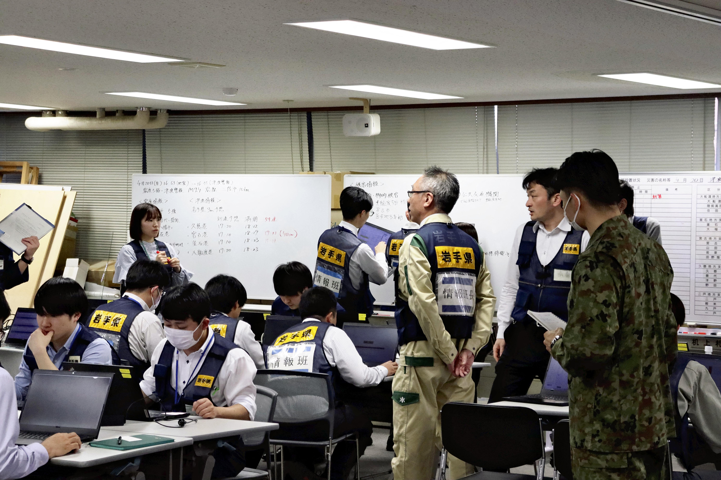Staff gather information about the earthquake and tsunami at the Iwate provincial government building on 20/4. Photo: AFP